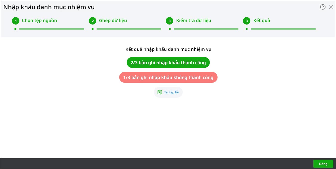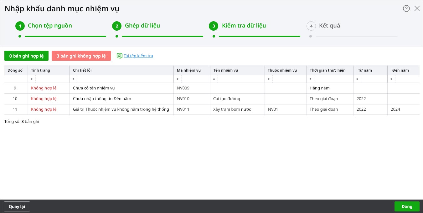 • Kiểm tra thông tin chi tiết lỗi trên giao diện hoặc nhấn Tải tệp kiểm tra để tải file kết quả về máy và kiểm tra lại. Sau đó quay lại bước 1 để cập nhật lại file nhập khẩu.