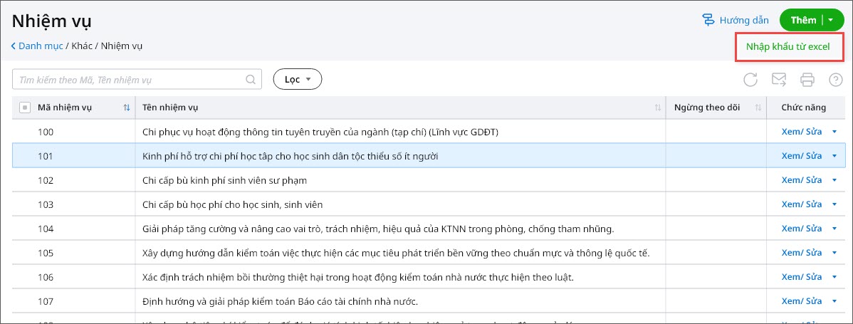 Nhập khẩu danh mục Nhiệm vụ chi