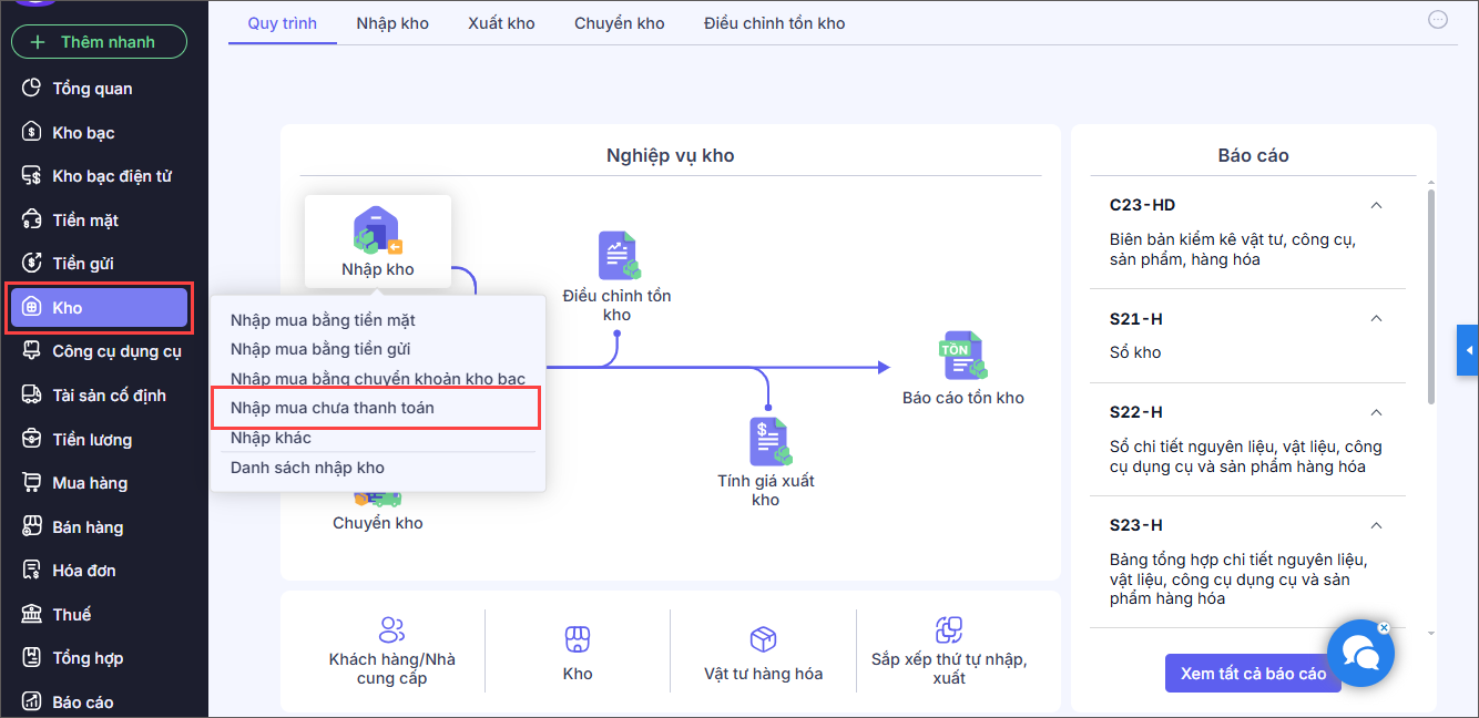 Bước 1: Vào menu Kho, chọn Nhập kho\Nhập mua chưa thanh toán.