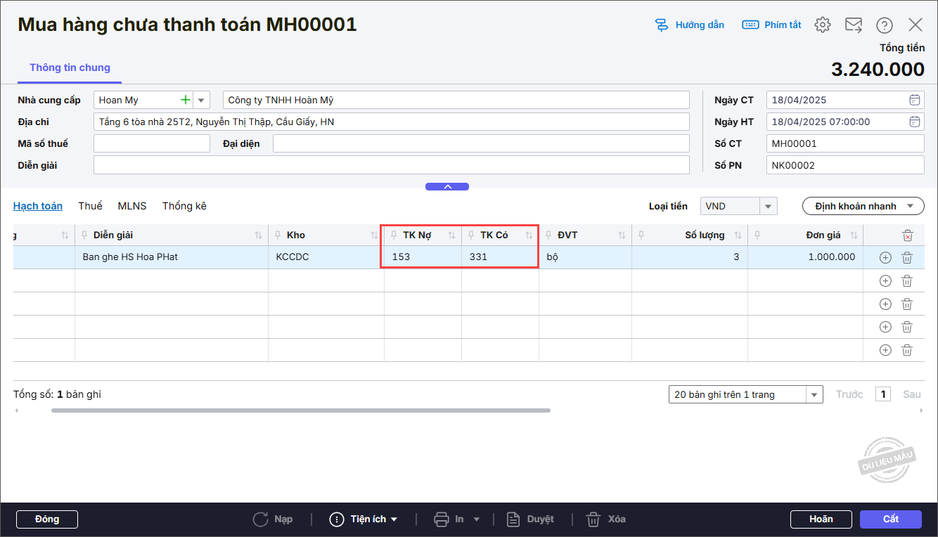 • Tại tab Hạch toán: Chọn Mã hàng nhập mua, nhập Số lượng, Đơn giá.