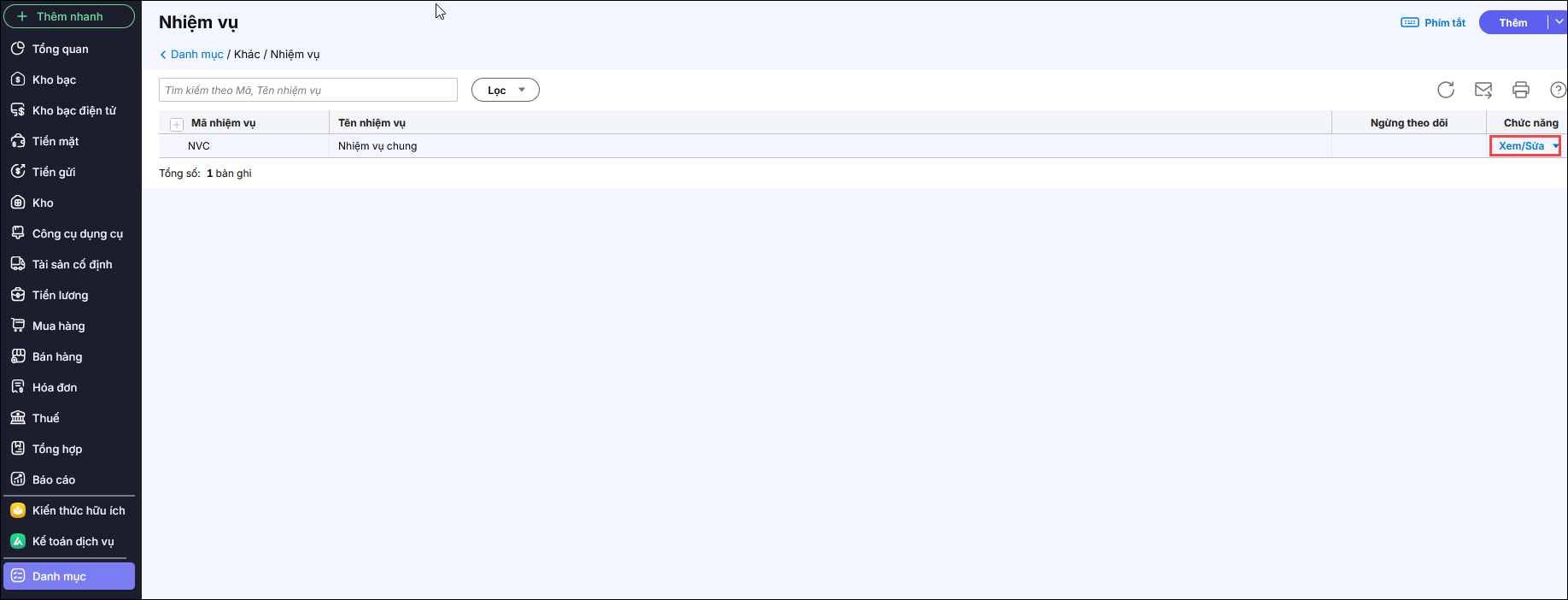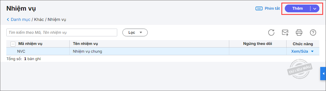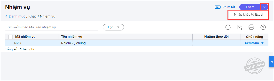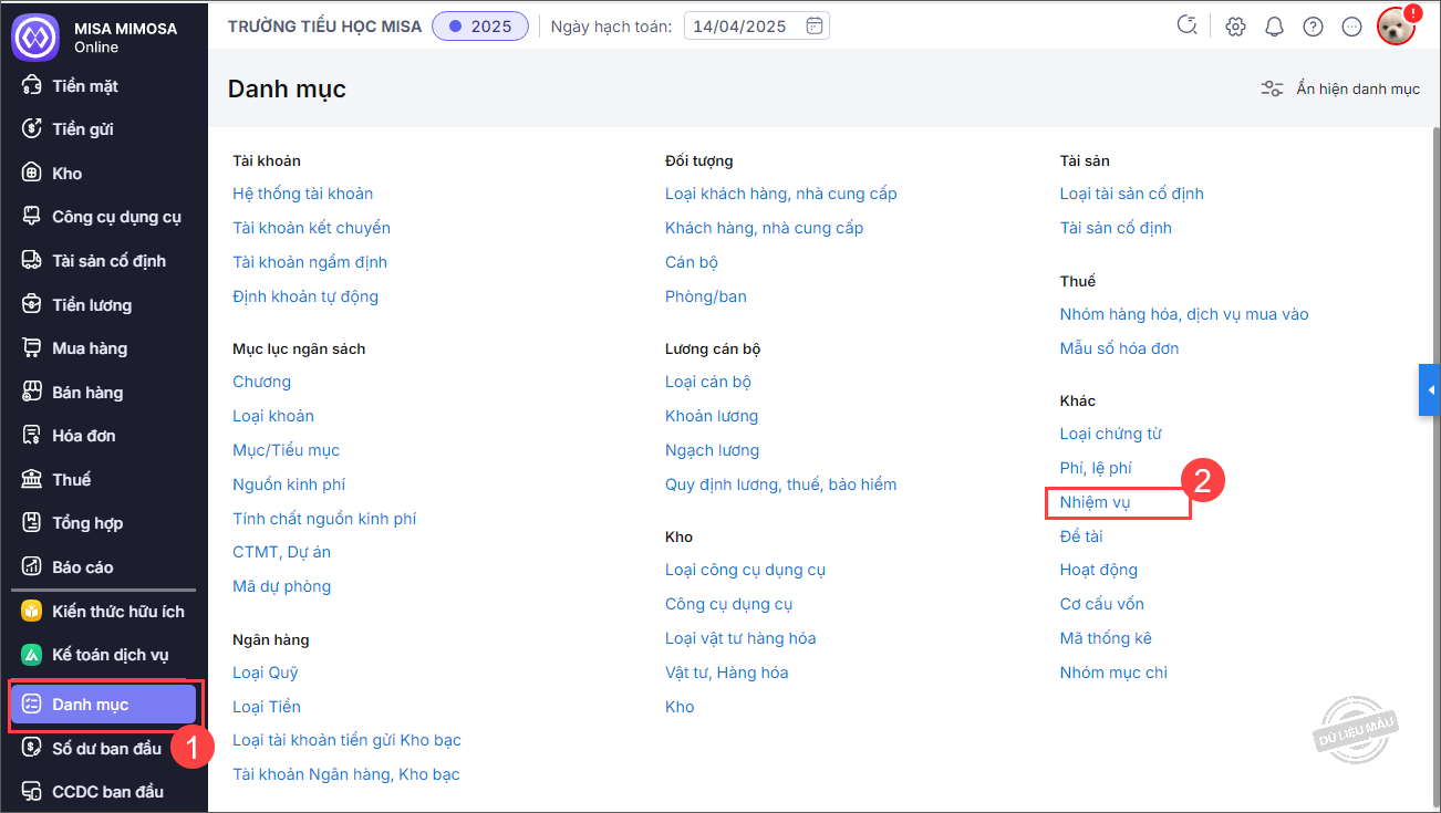 Bước 2: Vào menu Danh mục\Nhiệm vụ.