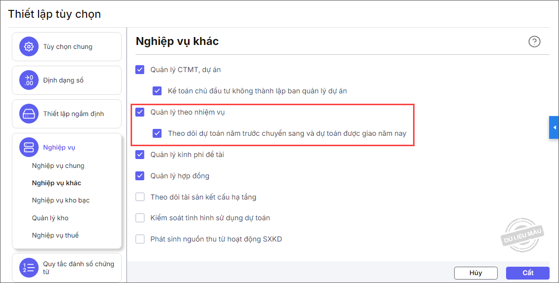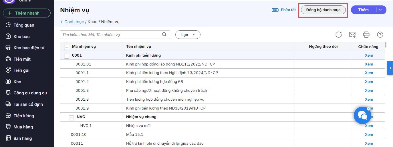 2.1. Thêm từ ứng dụng Ngân sáchTrường hợp đơn vị có sử dụng ứng dụng Ngân sách, đơn vị có thể thực hiện đồng bộ danh mục Nhiệm vụ từ ứng dụng Ngân sách về ứng dụng Kế toán. Bước 1: Hiển thị thiết lập Nhiệm vụ