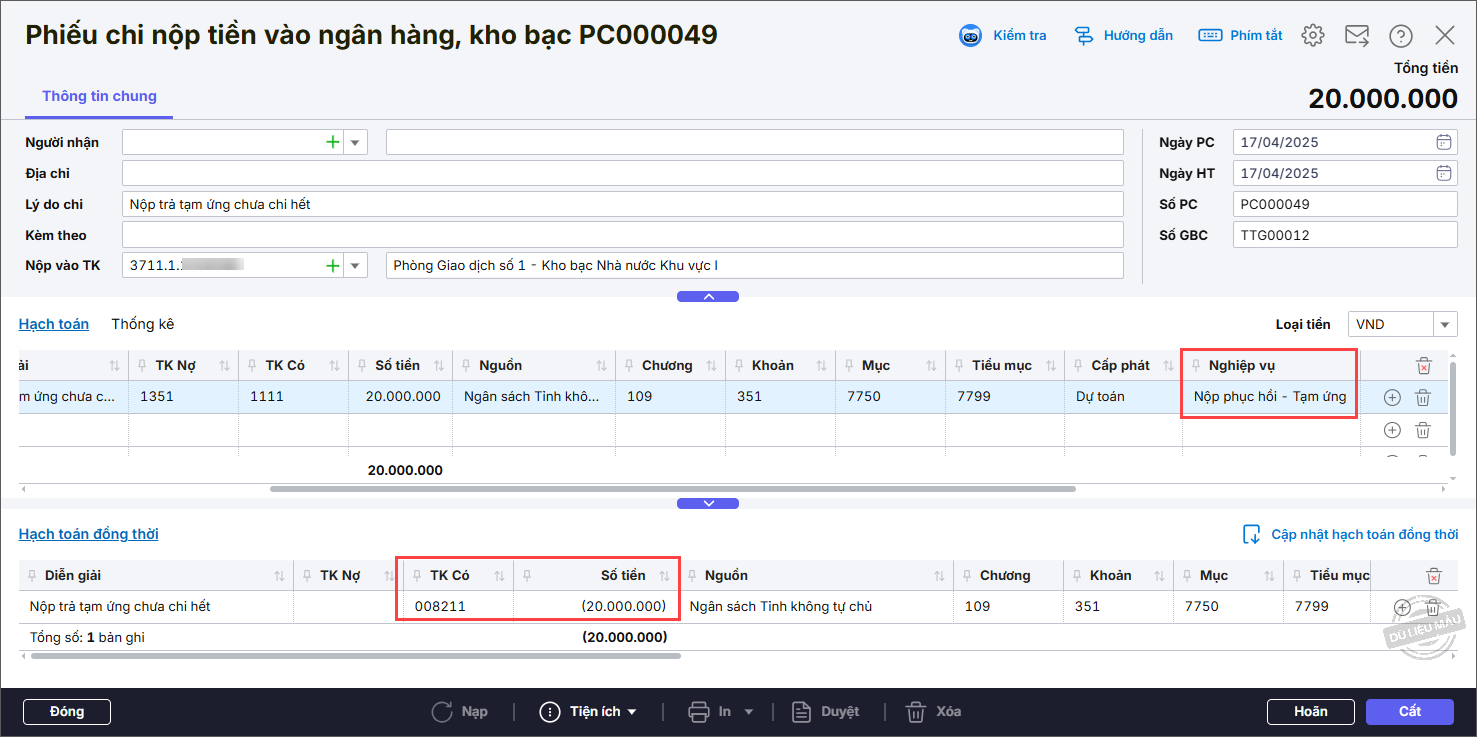 Lưu ý: Tại Bước 2 (tab Hạch toán), phải chọn đúng cột Nghiệp vụ là Nộp phục hồi – Tạm ứng. Nếu chọn sai, phần mềm sẽ không tự động hạch toán đồng thời (ghi âm Có TK 008), dẫn đến số liệu khi in Giấy nộp trả kinh phí (Mẫu số C2-05/NS) bị sai.