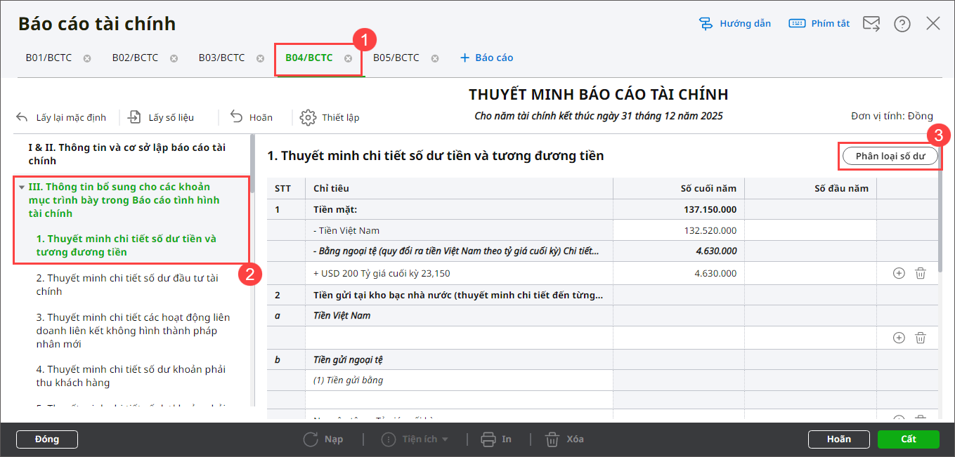 Bước 2: Chọn báo cáo B04/BCTC. Phần mềm đáp ứng chức năng Phân loại số dư tại các mục sau: III.1; III.2; III.4; III.6; III.7; III.12; III.13; III.14; III.16; III.17; III.19.