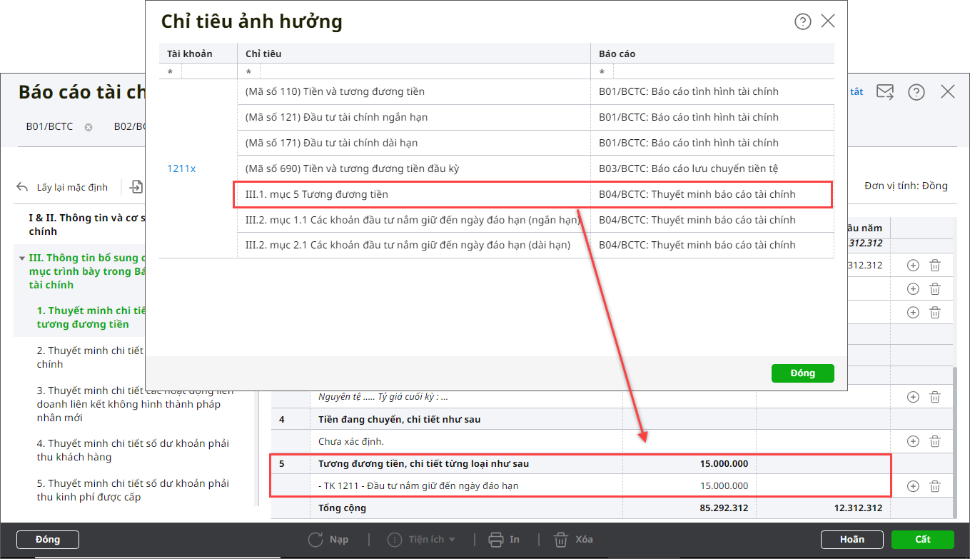 • Nhấn Xem chi tiết để xem các chỉ tiêu ảnh hưởng trên báo cáo B04/BCTC.