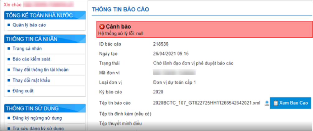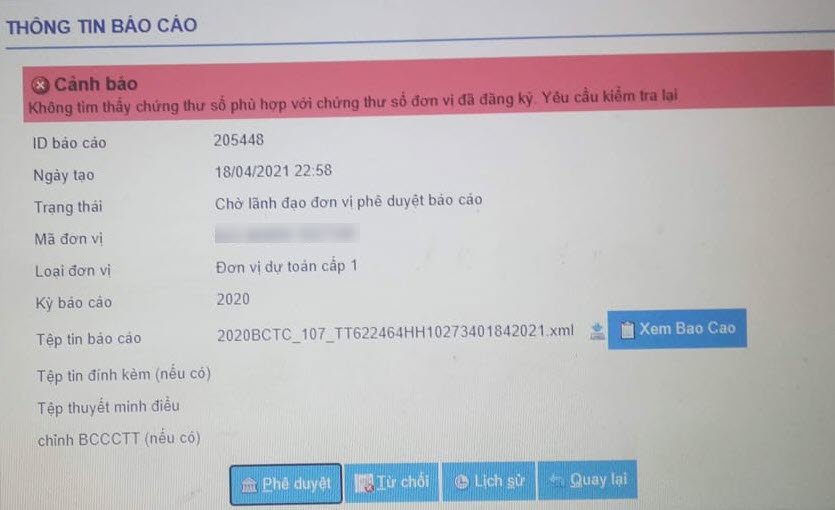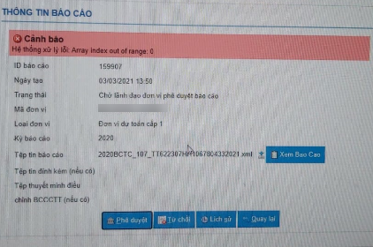 Khi lãnh đạo phê duyệt báo cáo để gửi KBNN nhận được Cảnh báo lỗi như sau: