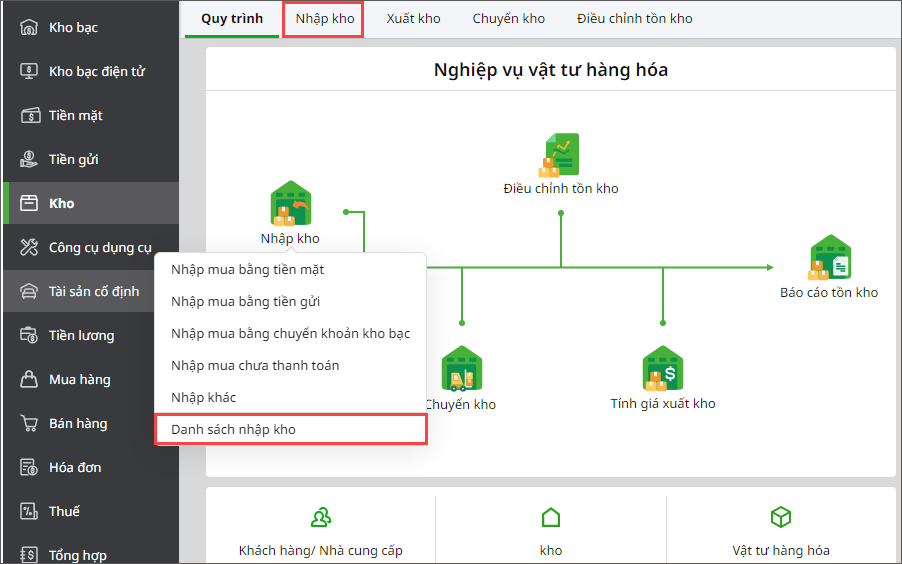Bước 1: Vào nghiệp vụ Kho, chọn Nhập kho\Danh sách nhập kho hoặc vào tab Nhập kho.