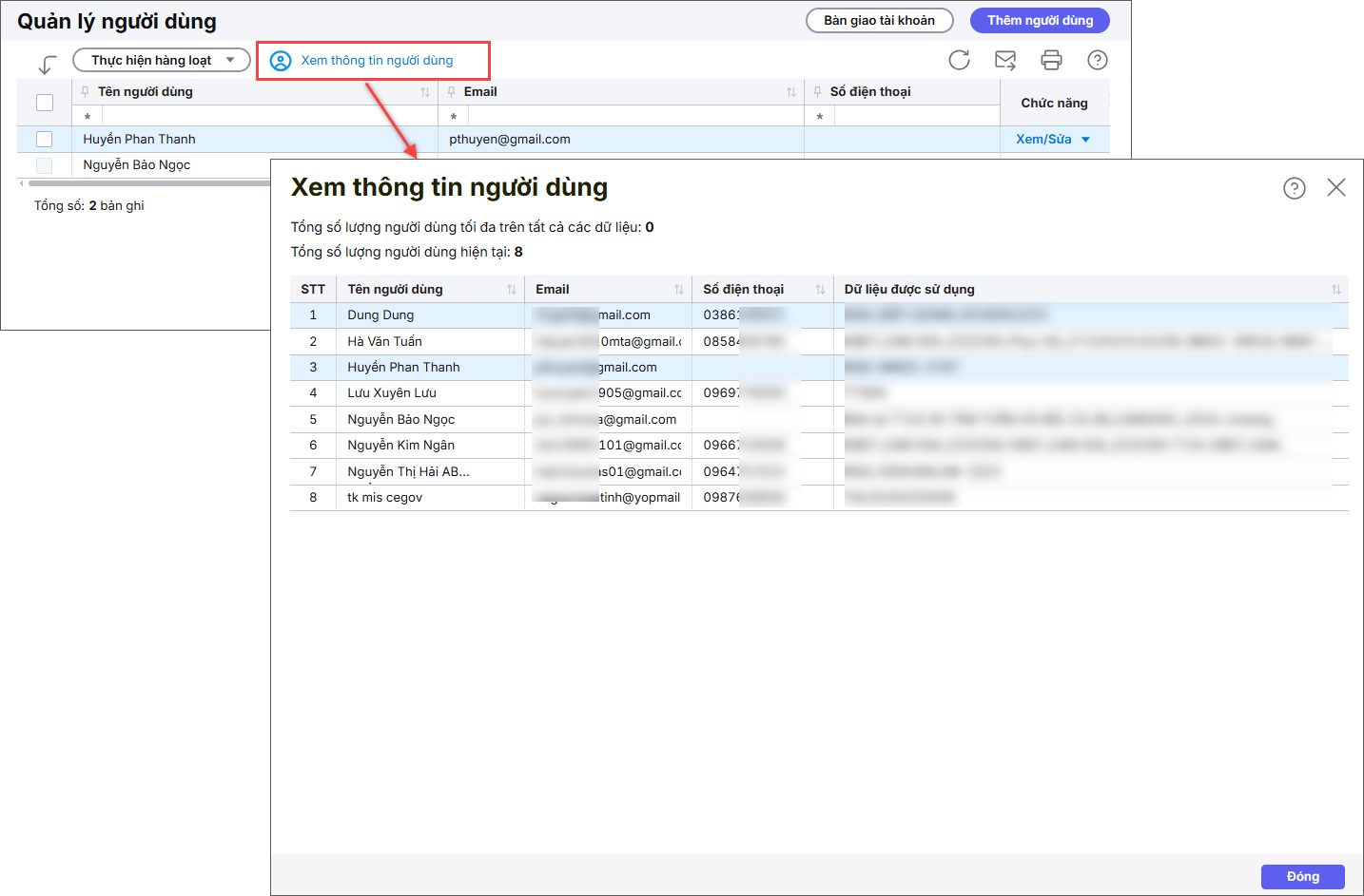 Để biết được số lượng người dùng tối đa, số lượng người dùng hiện tại của đơn vị trên phần mềm, nhấn Xem thông tin người dùng.