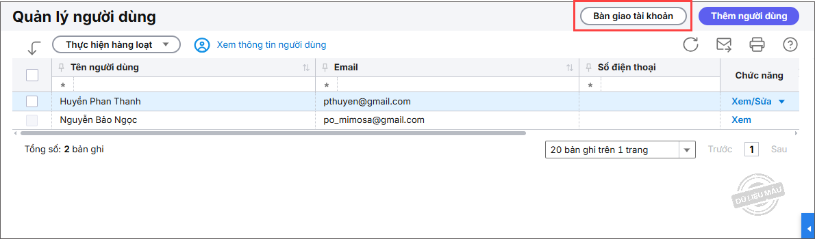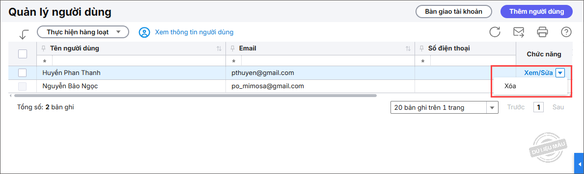 Bước 2: Hệ thống mặc định hiển thị cán bộ được cấp quyền truy cập vào phần mềm khi cấp thuê bao ban đầu có vai trò là Quản trị dữ liệu. Bước 3: Để thêm người dùng mới, nhấn Thêm người dùng.
