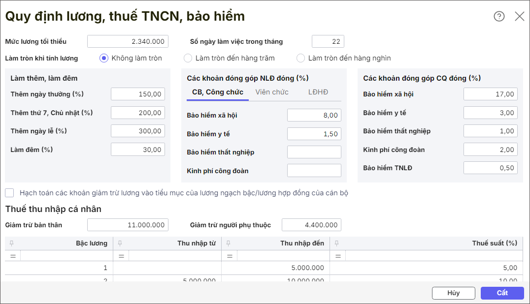 Bài viết nhằm hướng dẫn đơn vị thiết lập các quy định lương, thuế, bảo hiểm theo quy định của chế độ hiện nay. Phần mềm sẽ căn cứ vào số liệu trên biểu này để tính thuế thu nhập cá nhân, các khoản bảo hiểm, các khoản lương tối thiểu và lương làm thêm, làm đêm
