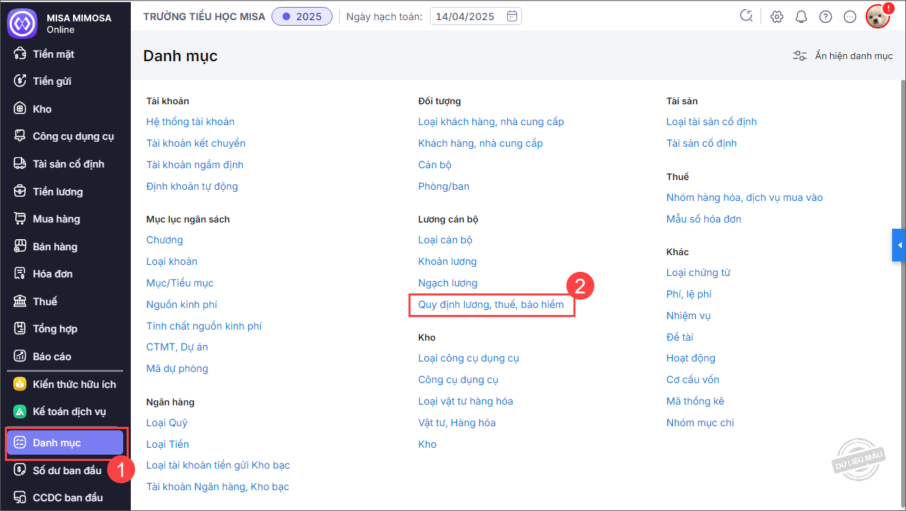 Bước 1: Chọn menu Danh mục\Quy định lương, thuế, bảo hiểm.