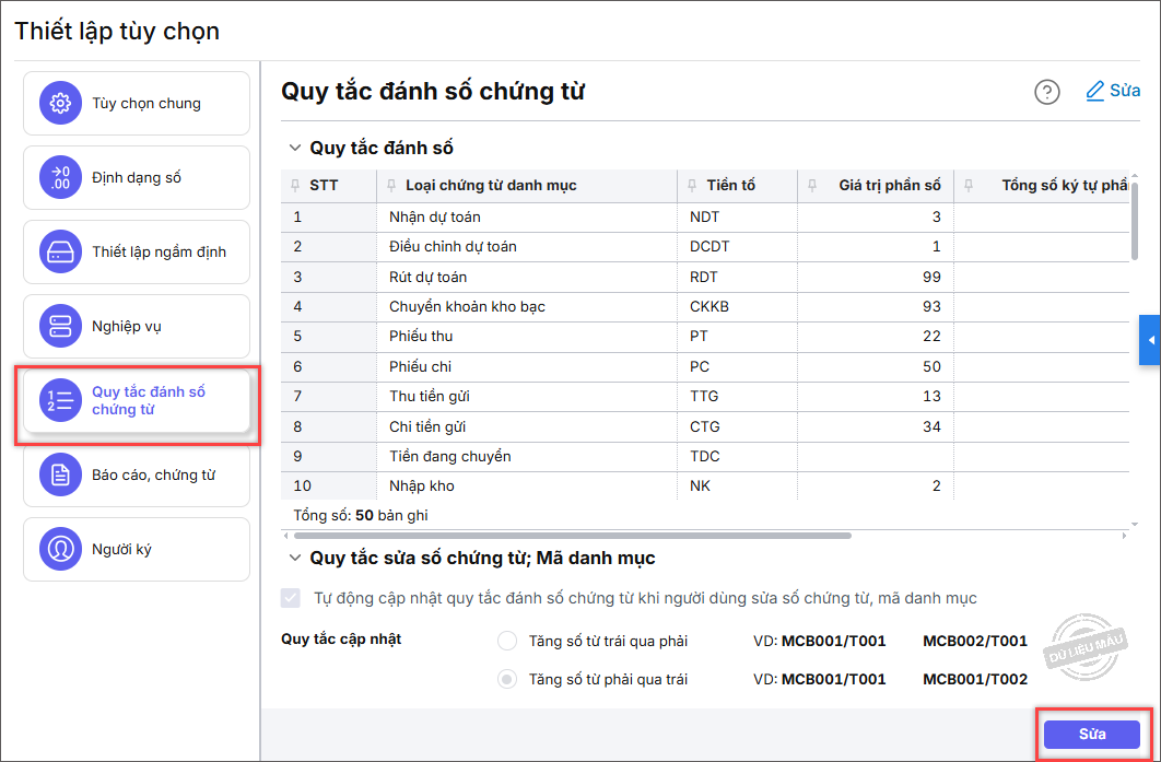 Bước 2: Chọn tab Quy tắc đánh số chứng từ. Nhấn Sửa.