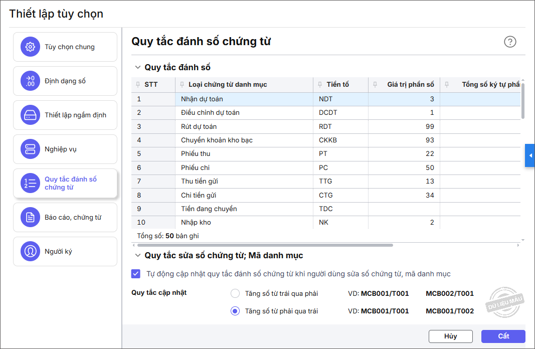 Bước 3: Ở Quy tắc đánh số: Tùy chỉnh thiết lập quy tắc cho từng loại chứng từ phần mềm đã mặc định sẵn.