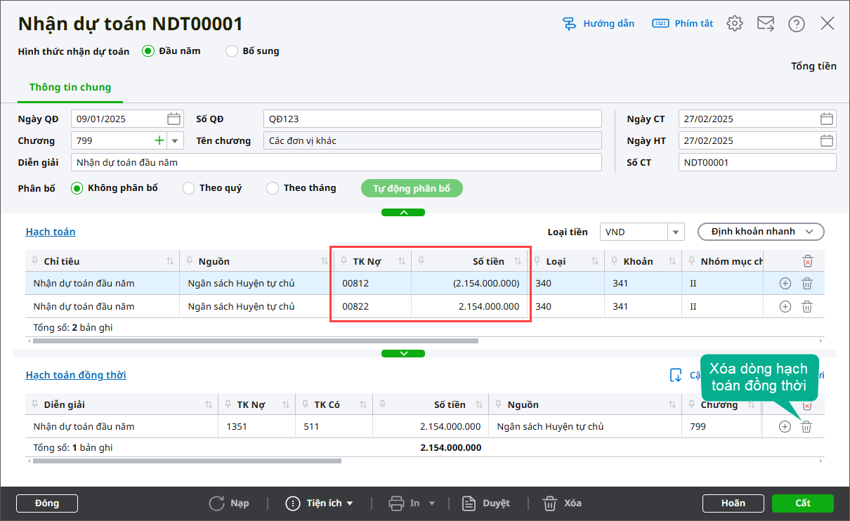 - Hạch toán Nợ TK 00812 (ghi âm); Nợ TK 00822 (ghi dương) và chọn nguồn tự chủ (nguồn thường xuyên)