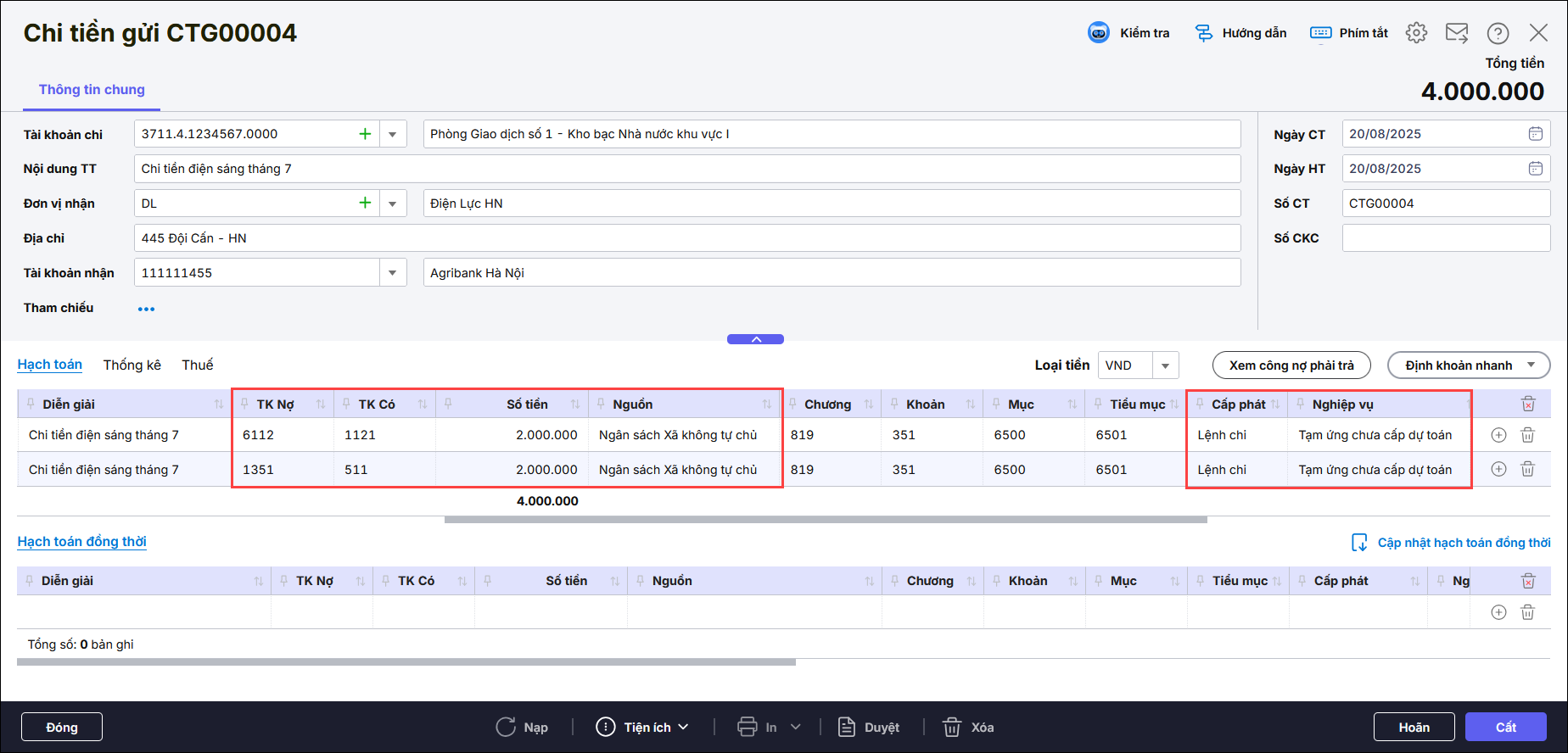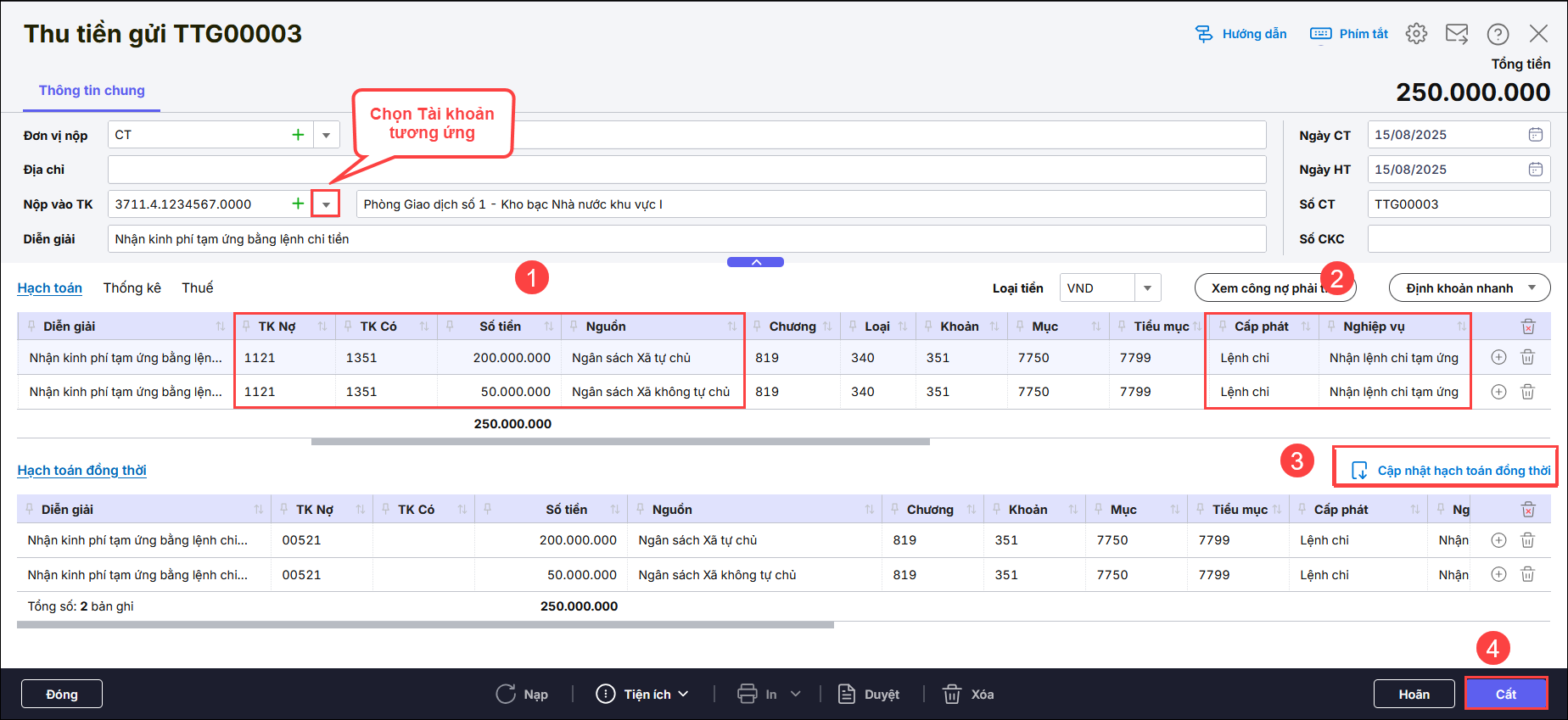 - Nhập TK Nợ, TK Có, Nguồn, chương, khoản, số tiền