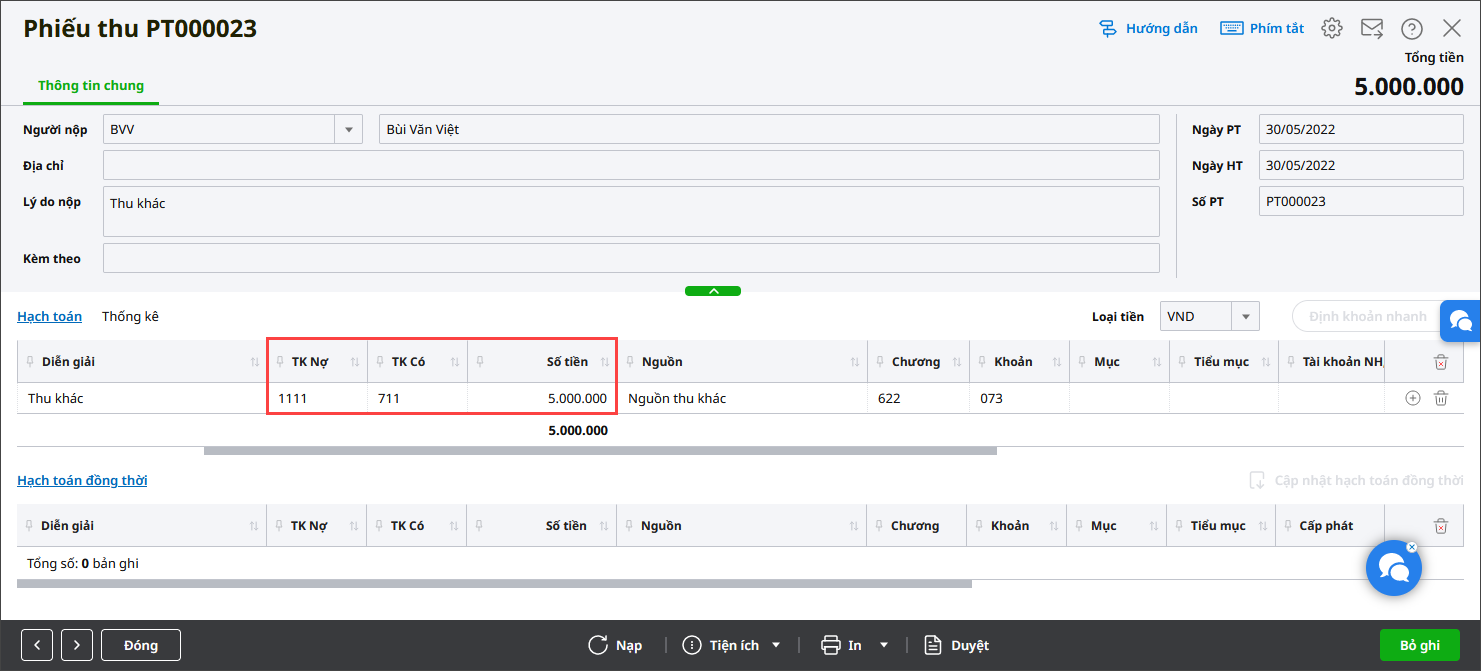 - Hạch toán Nợ TK 111/ Có TK 711, số tiền.