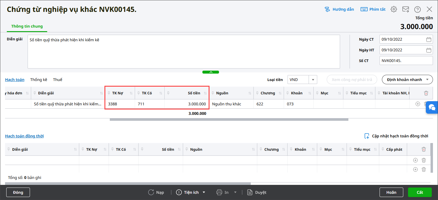 - Nhập Nợ TK 3388/ Có TK 711, số tiền.