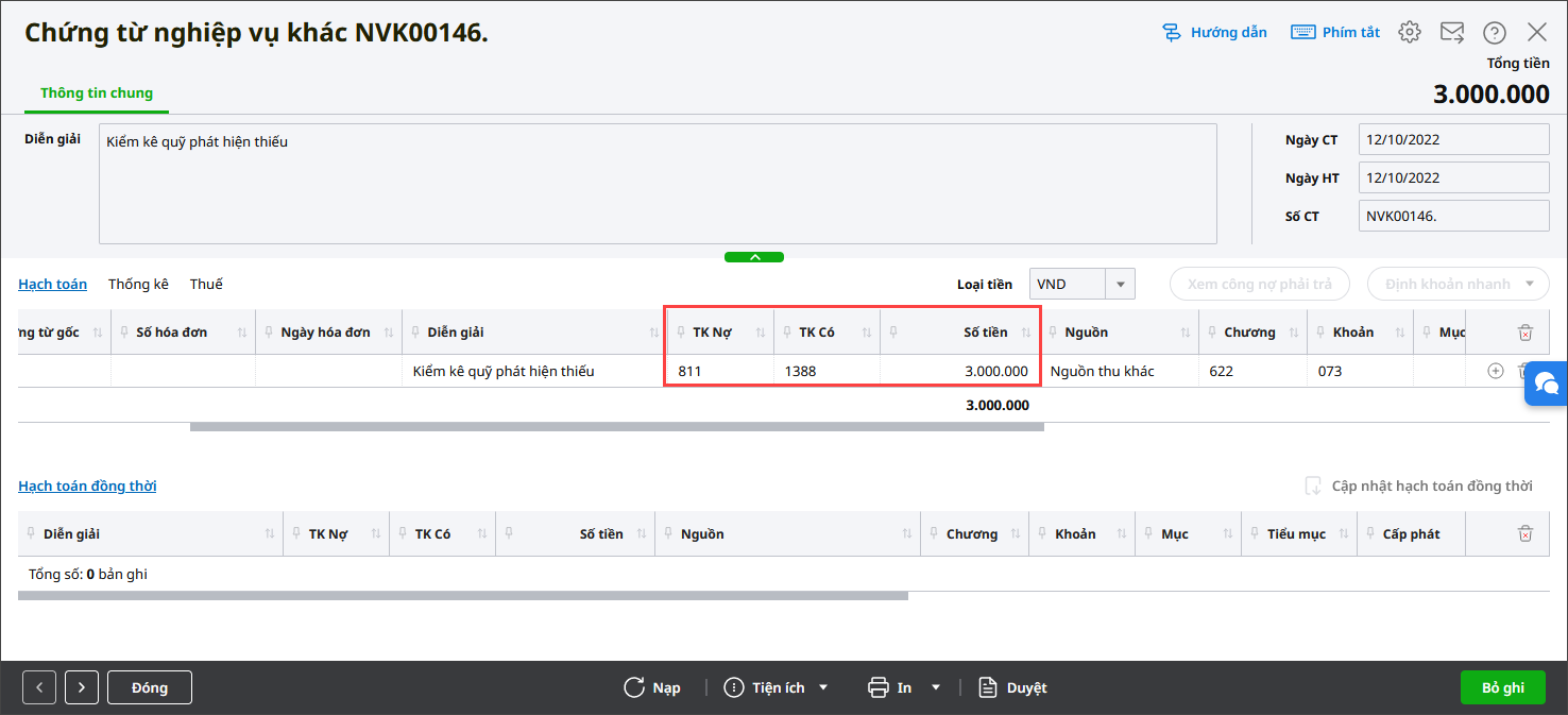 - Nhập Nợ TK 811/ Có TK 138, số tiền.