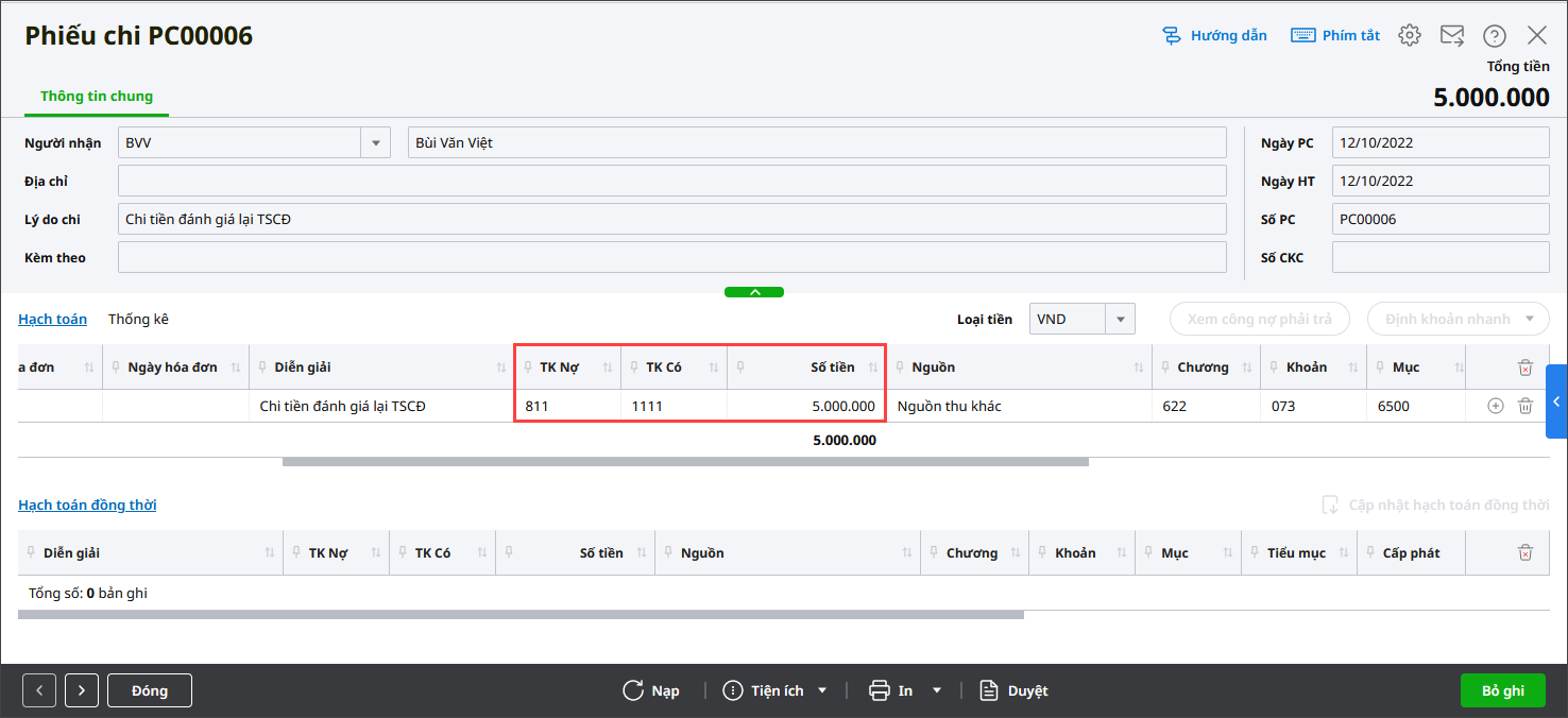 - Hạch toán Nợ TK 811/ Có TK 111, số tiền.