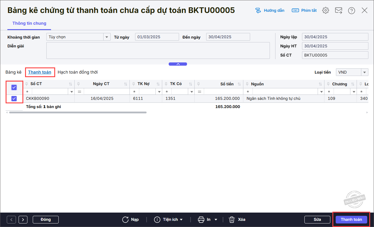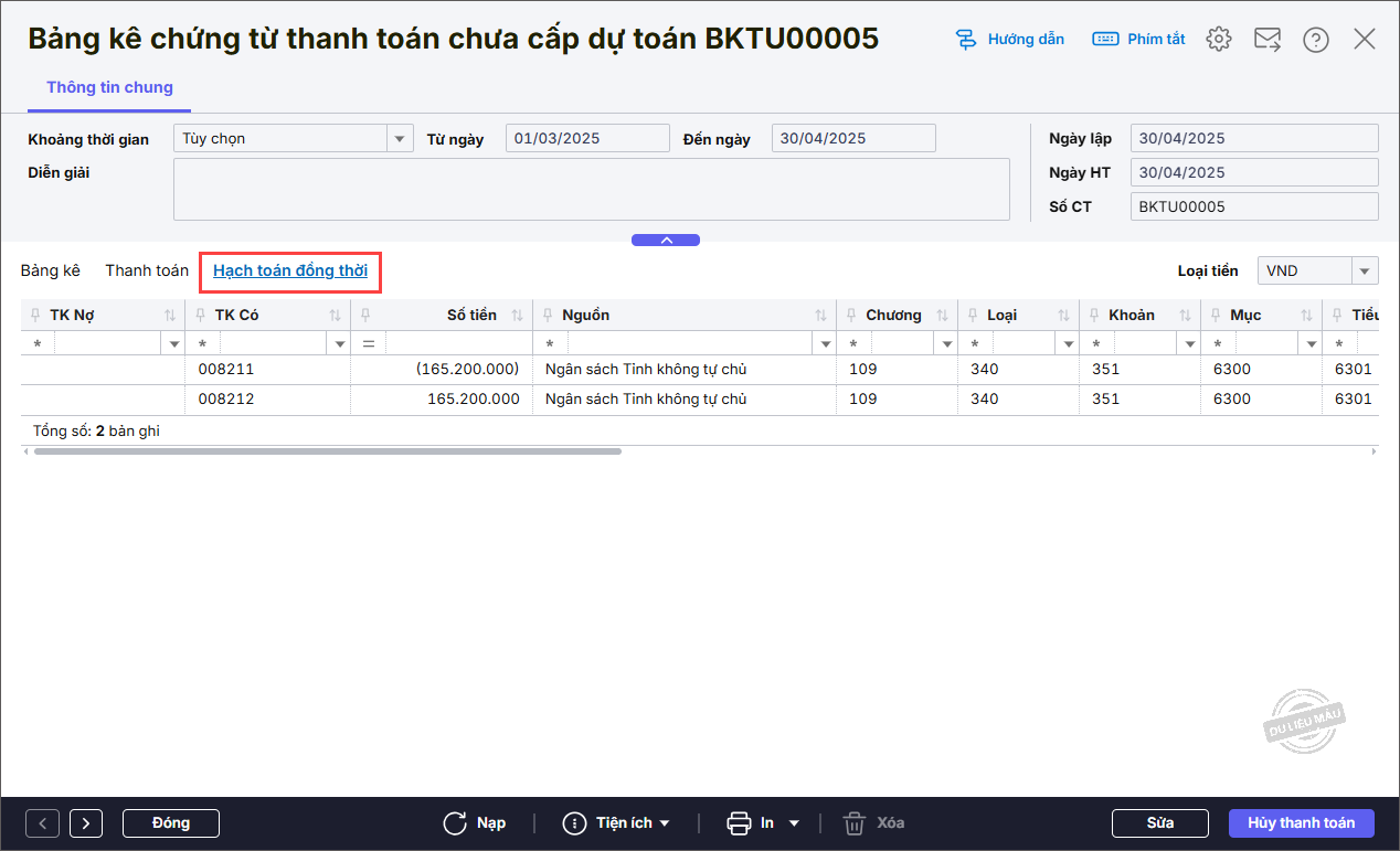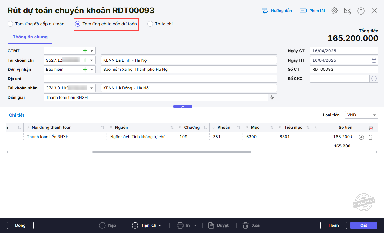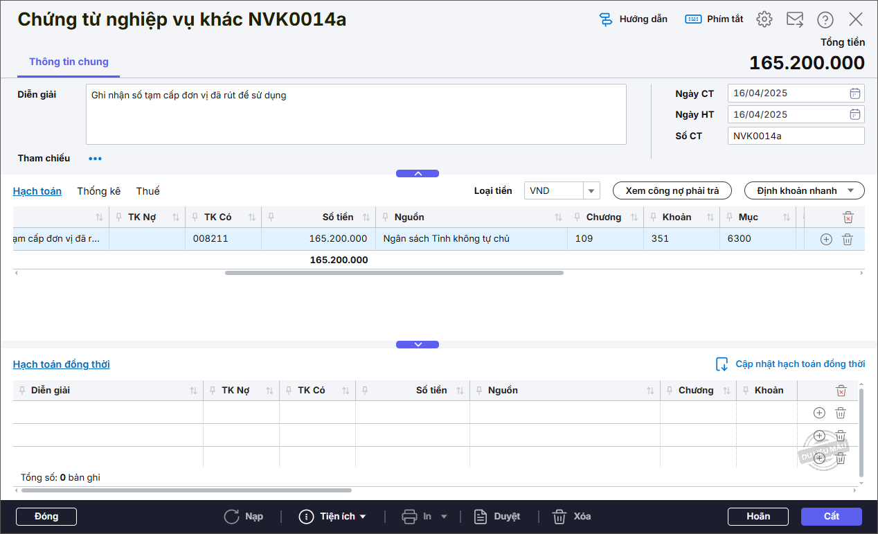 - Với Nghiệp vụ là Tạm ứng chưa cấp dự toán chương trình không sinh hạch toán đồng thời.