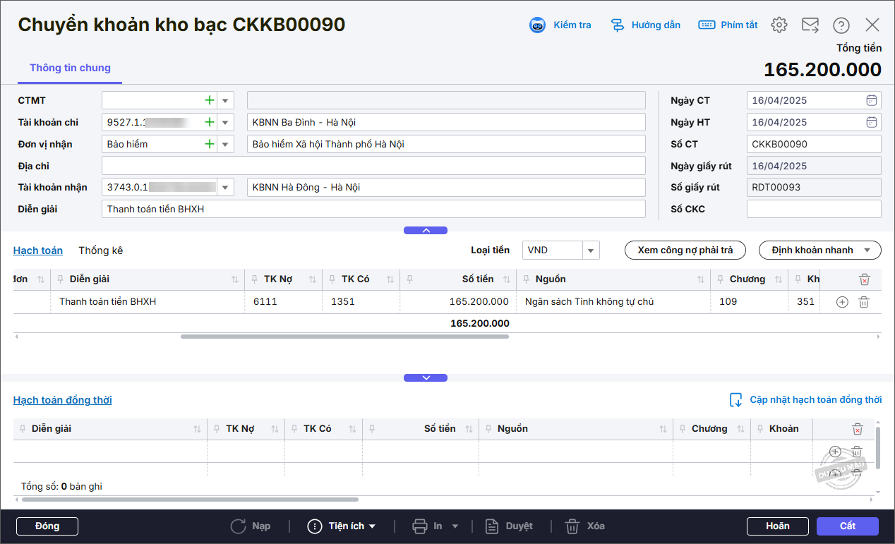 - Nhập thông tin chung: Tài khoản chi, Đơn vị nhận, Tài khoản nhận, Diễn giải.