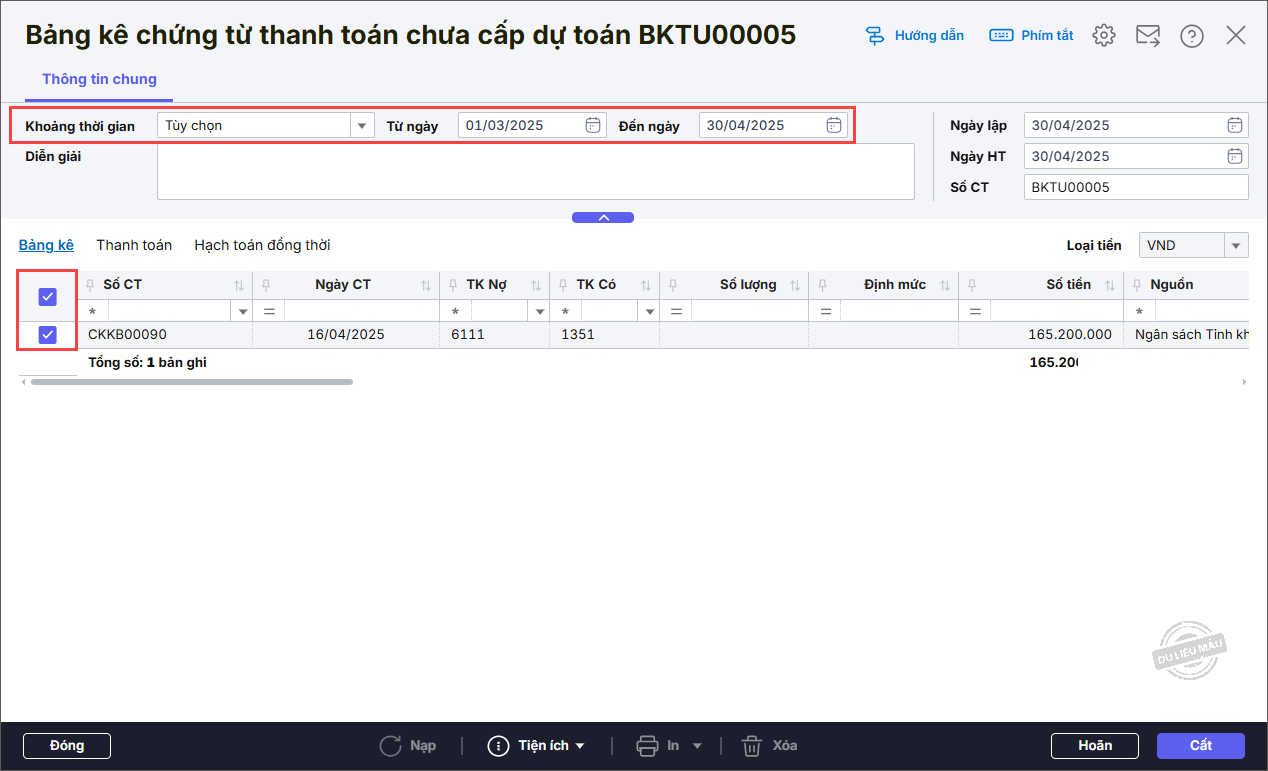 3. Chọn Khoảng thời gian cần lập bảng kê những chứng từ chi tạm ứng.