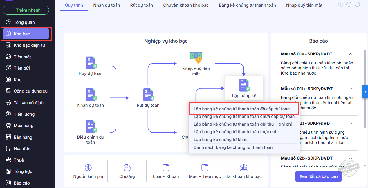 1. Vào nghiệp vụ Kho bạc, chọn Lập bảng kê\Lập bảng kê chứng từ thanh toán đã cấp dự toán.