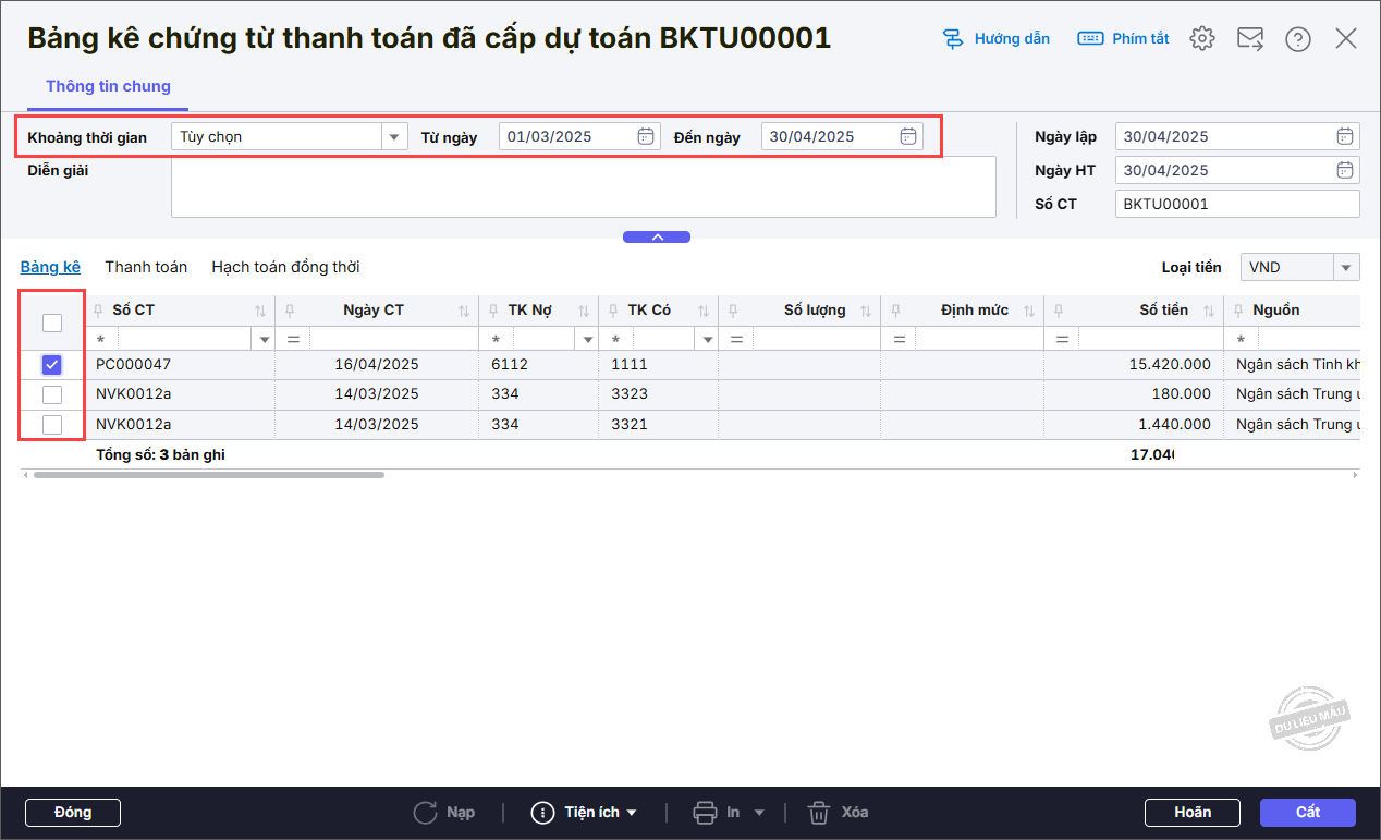 2. Chọn Khoảng thời gian cần lập bảng kê những chứng từ chi tạm ứng.