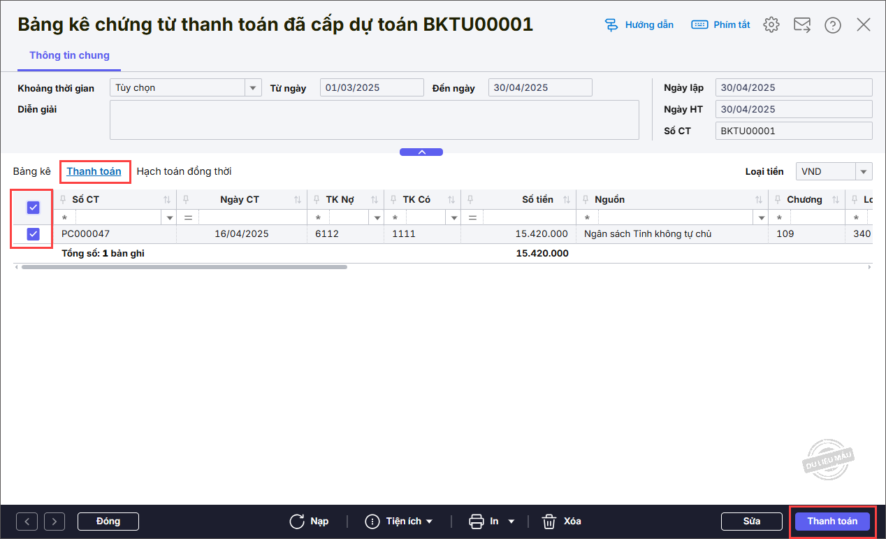 4. Tại tab Bảng kê: tích chọn những chứng từ chi tạm ứng cần lập bảng kê.