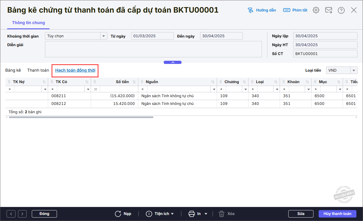 4. Hệ thống sinh chứng từ đồng thời tại tab Hạch toán đồng thời.