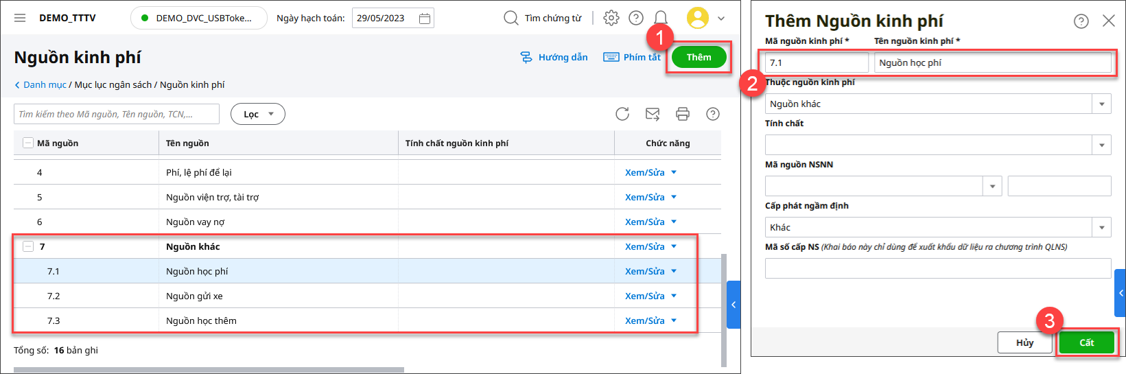 2. Nhấn chuột trái 1 lần vào dòng Nguồn khác rồi Nhấn Thêm. 3. Khai báo thông tin nguồn con, nhấn Cất. Lưu ý: Mã nguồn con bắt đầu bằng mã nguồn cha (Ví dụ nguồn khác mã là 7 thì mã các nguồn con sẽ là 7.1, 7.2,…), tham khảo hướng dẫn chi tiết tại đây.