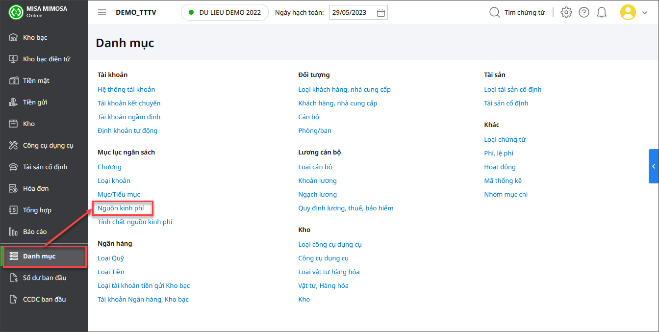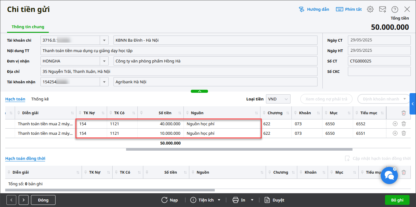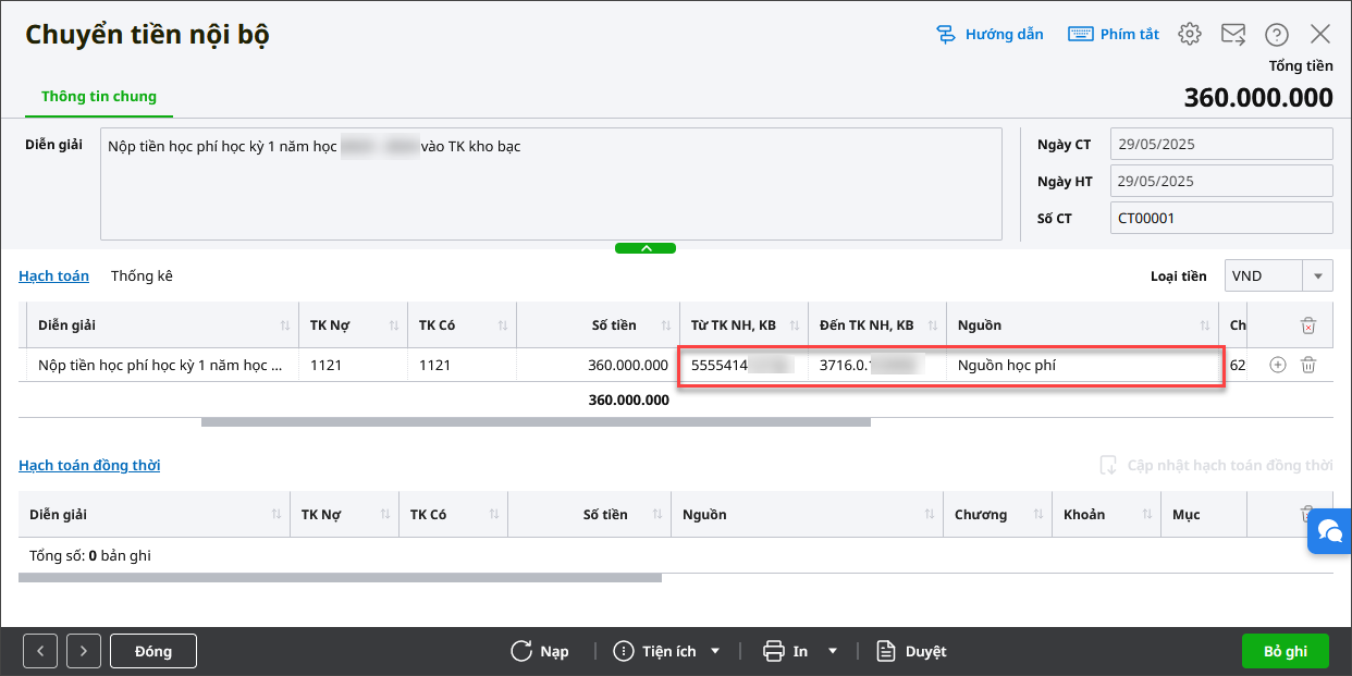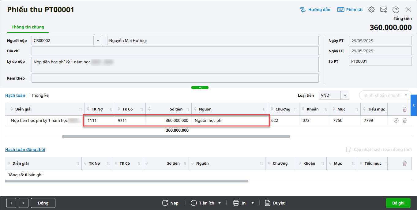 Lưu ý: 1. Đối với các khoản thu từ hoạt động sản xuất kinh doanh, dịch vụ, bạn có thể mở thêm nguồn con của nguồn khác tại Danh mục\Nguồn kinh phí.