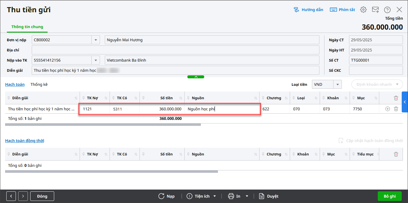 Trường hợp 2: Thu viện phí, dịch vụ khám chữa bệnh bằng qua tiền gửi ngân hàngBước 1: Vào nghiệp vụ Tiền gửi, chọn Thu tiền\Thu tiền gửi. Bước 2: Khai báo thông tin chứng từ trên Thu tiền gửi.