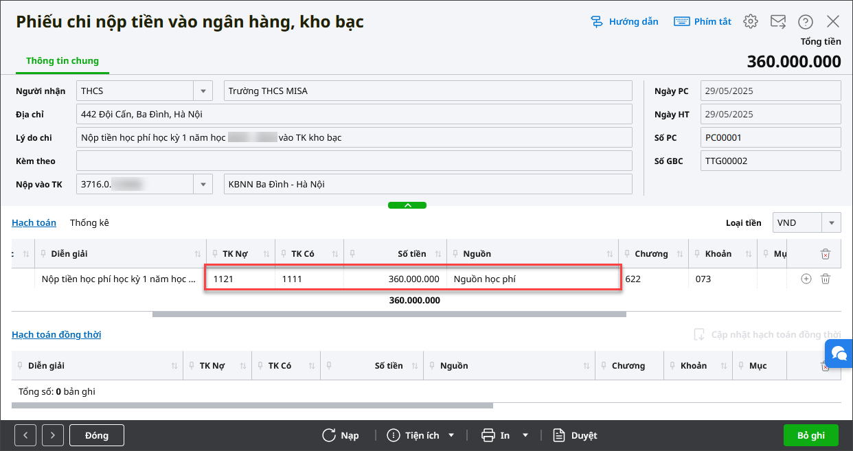 3.2. Nộp tiền vào tài khoản ngân hàng, kho bạcTrường hợp 1: Nộp tiền vào TK kho bạc