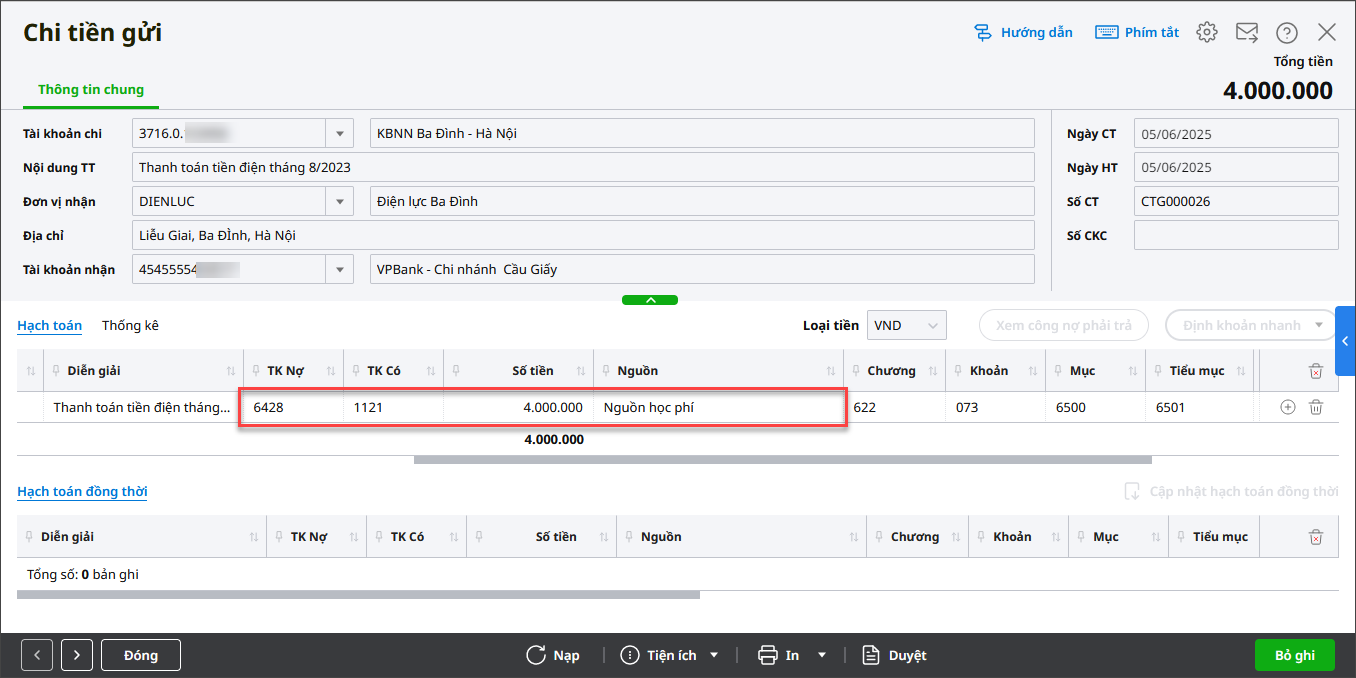 Trên chứng từ thanh toán tiền điện tháng 4, số tiền: 4.000.000 đồng: