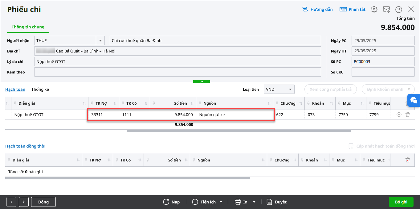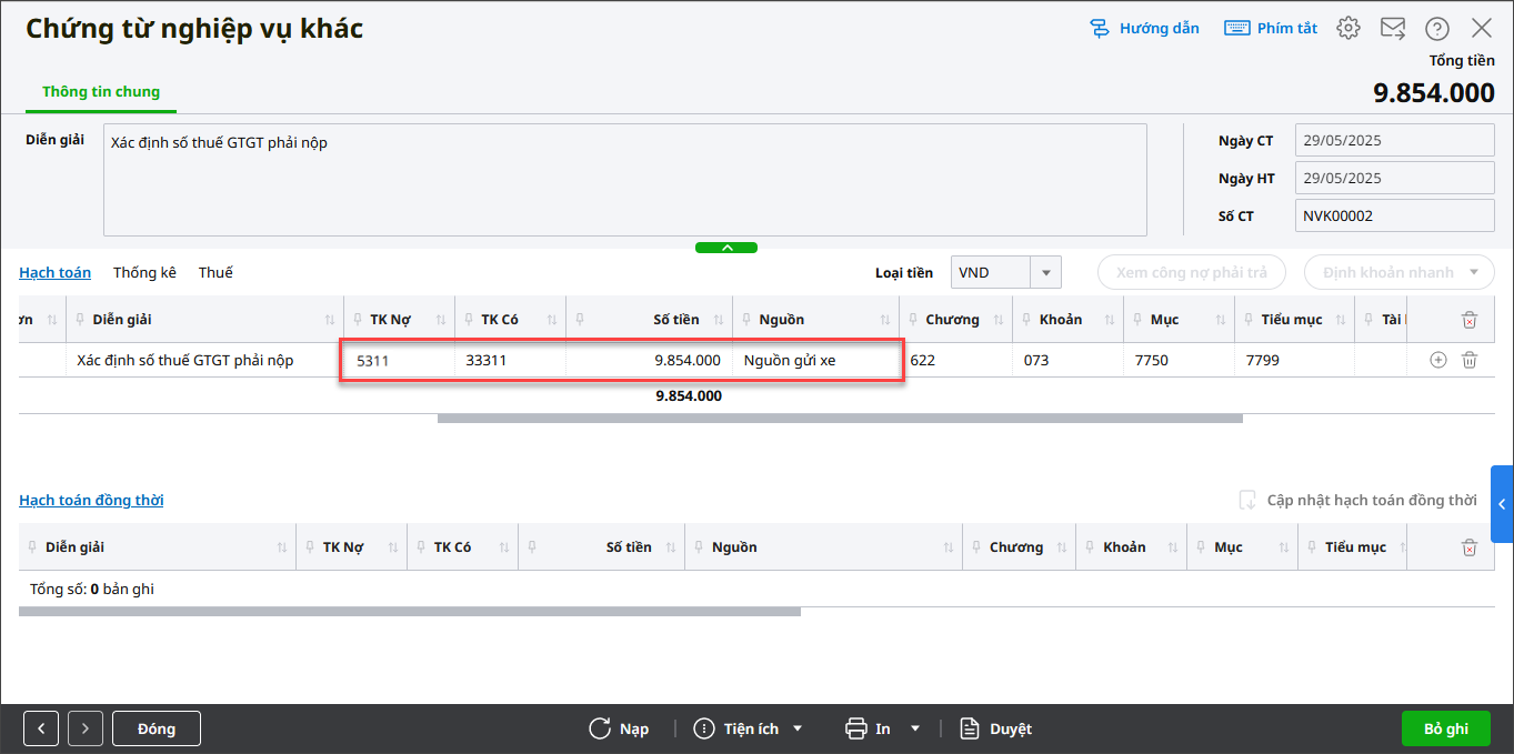 3.6 Hạch toán các khoản thuếBạn tham khảo hướng dẫn chi tiết tại đây 3.6.1. Hạch toán thuế GTGT– Bước 1: Xác định số thuế GTGT phải nộp: Vào Tổng hợp\Chứng từ NVK: Hạch toán Nợ TK 531/Có TK 33311, số tiền phải nộp (trích 5% hoặc 2% của các nguồn thu dịch vụ)