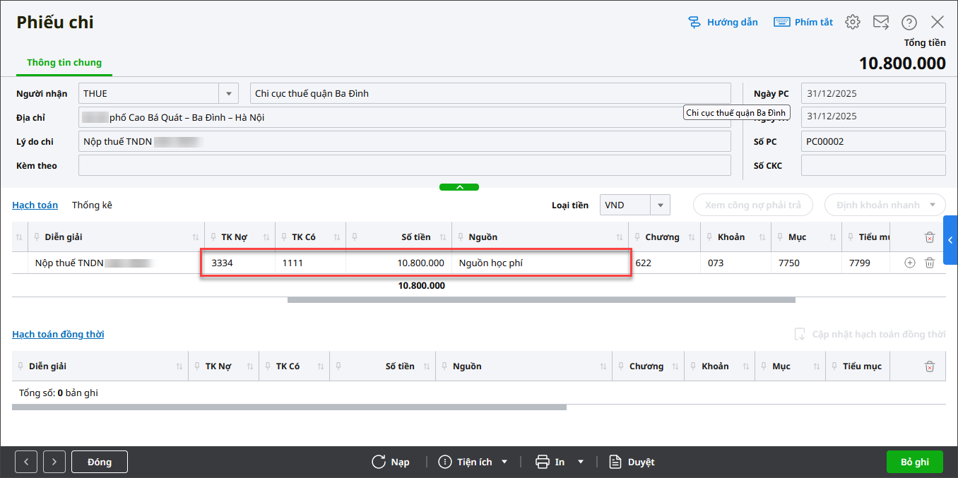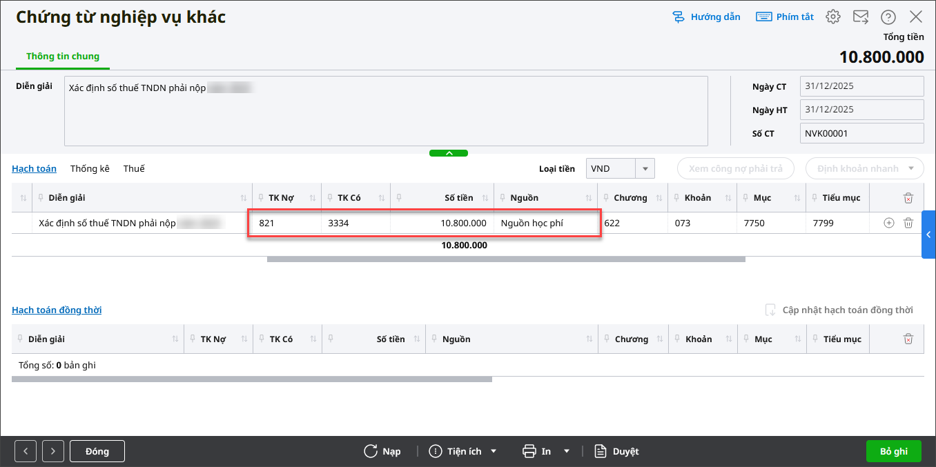 3.6.2. Hạch toán thuế TNDN– Bước 1: Xác định số thuế TNDN phải nộp: Vào Tổng hợp\Chứng từ NVK: Hạch toán Nợ TK 821/Có TK 3334, số tiền phải nộp