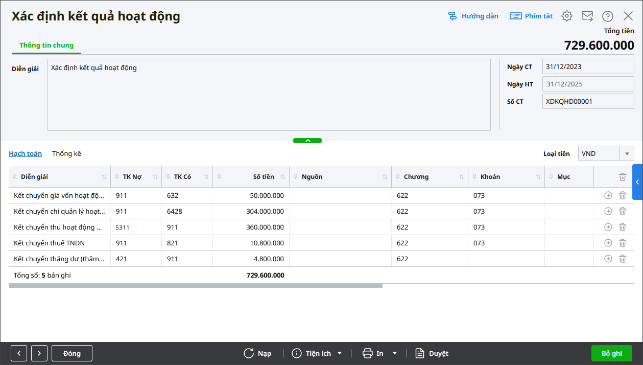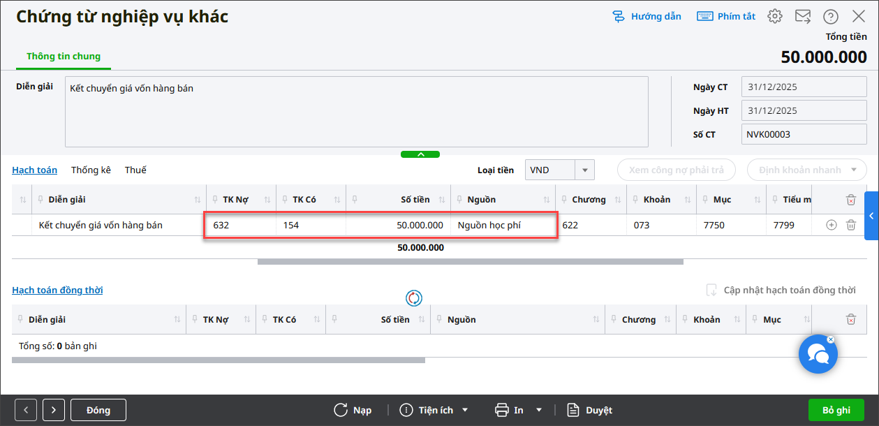 3.7. Xác định kết quả hoạt độngLưu ý: Trường hợp có phát sinh hạch toán chi phí trực tiếp trên TK 154, bạn cần kết chuyển TK 154 sang TK 632 trước khi xác định kết quả hoạt động. Thao tác xác định kết quả hoạt động chỉ làm vào thời điểm cuối kỳ ( tháng, quý, năm) trước khi lập báo cáo tài chính, báo cáo quyết toán. Vào Tổng hợp\Chứng từ nghiệp vụ khác, hạch toán Nợ TK 632/Có TK 154, số tiền là số dư Nợ TK 154 cuối kỳ.