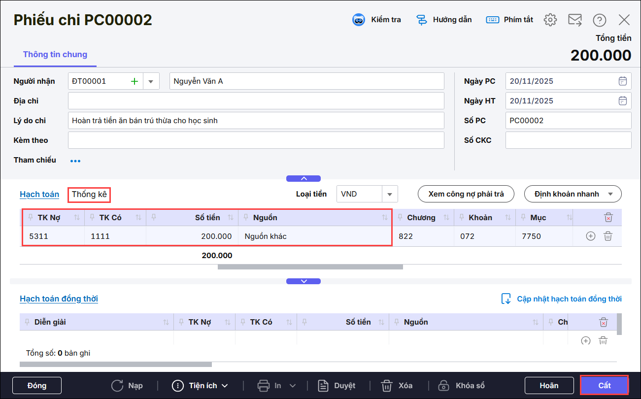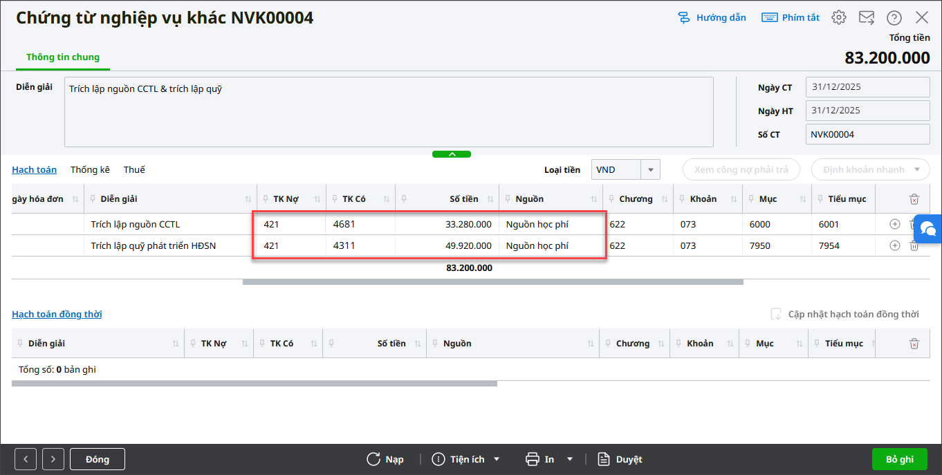 Bước 3: Nhấn Cất. 3.8 Trích lập nguồn CCTL (35%) và trích lập các quỹ theo quy định