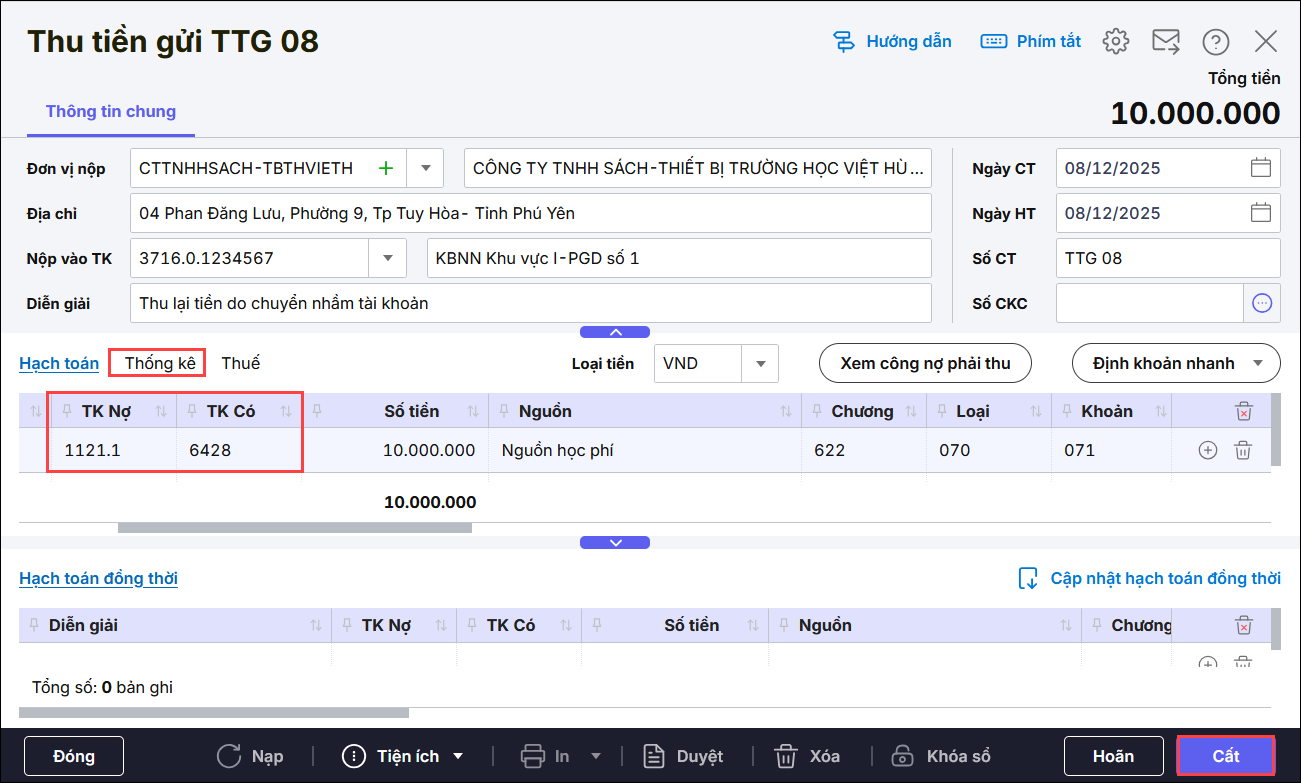 4.5 Hạch toán thu lại tiền chi sai, chi thừa, nhầm tài khoản, đối tượngBước 1: Vào Tiền mặt\Lập phiếu thu\Phiếu thu hoặc vào Tiền gửi\Thu tiền\Thu tiền gửi Bước 2: Nhập thông tin cho chứng từ chi tiền gửi