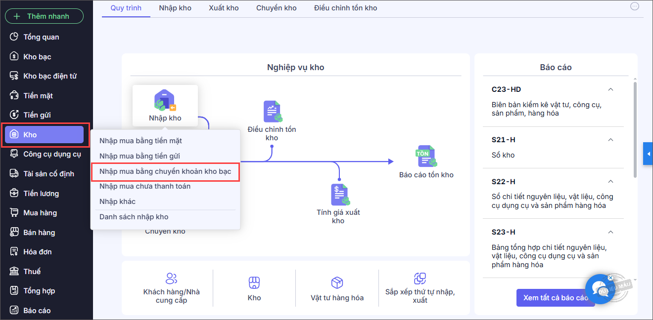 1. Vào nghiệp vụ Kho, chọn Nhập kho\Nhập mua bằng chuyển khoản kho bạc.