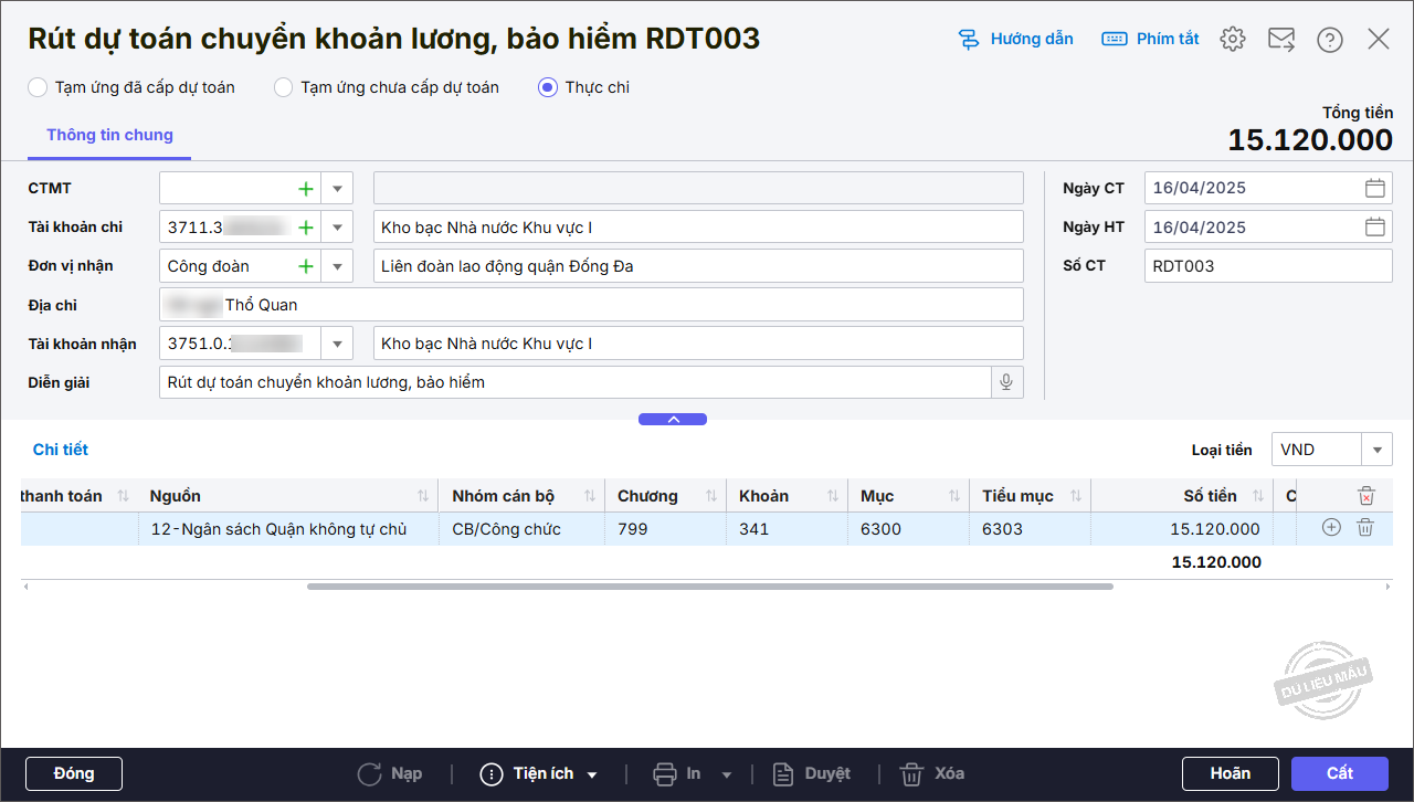Để nhập chứng từ rút dự toán nộp kinh phí công đoàn trên phần mềm Misa Mimosa online bạn làm như sau: