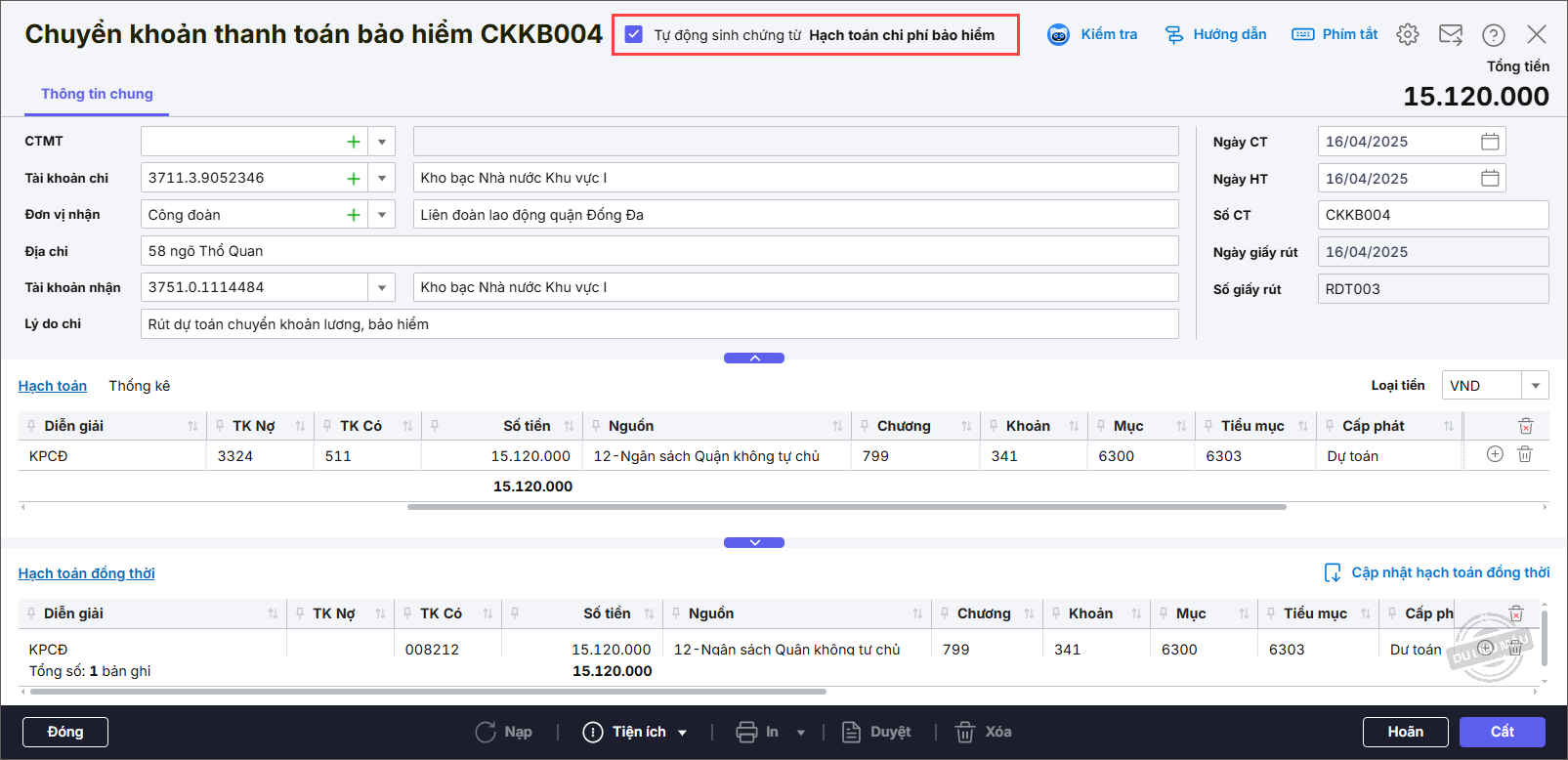 Bước 4: Anh/chị kiểm tra các thông tin trên chứng từ Chuyển khoản thanh toán bảo hiểm, phần mềm mặc định sinh hạch toán kế toán.