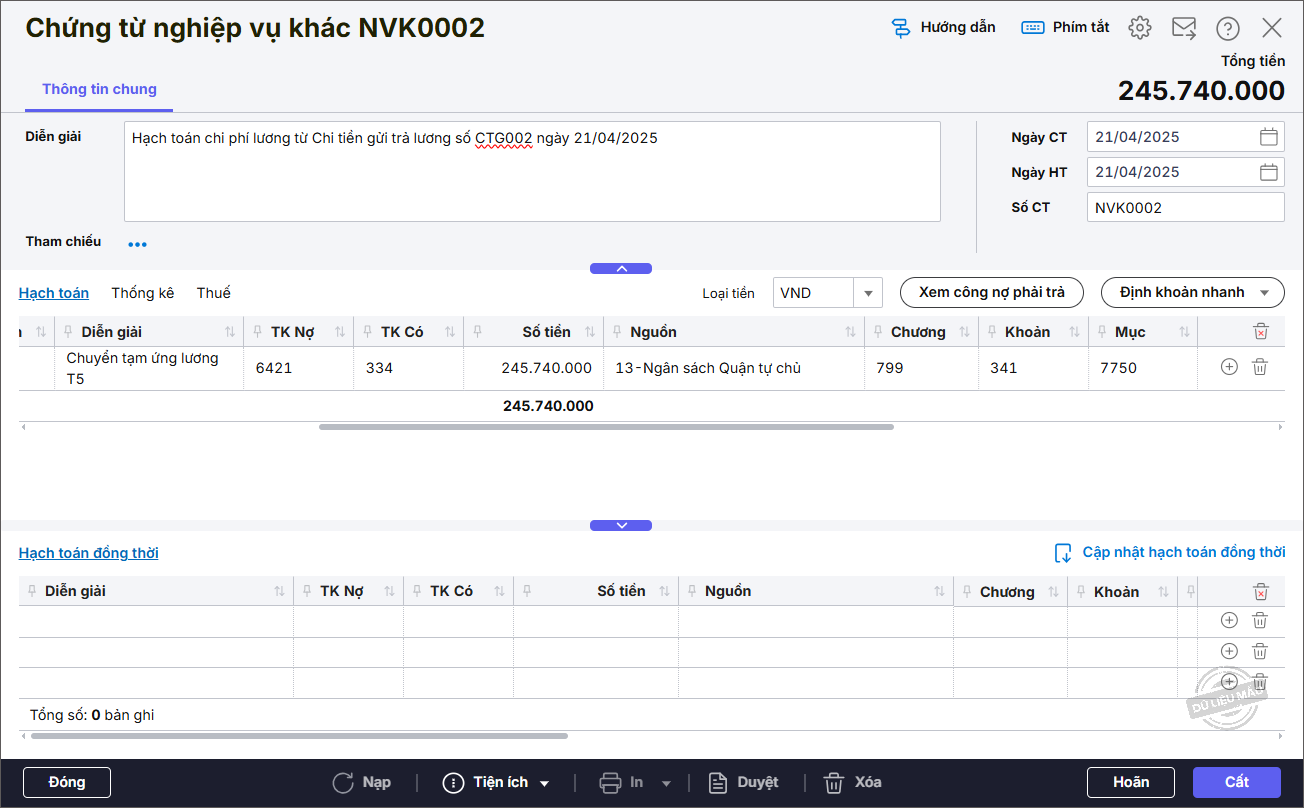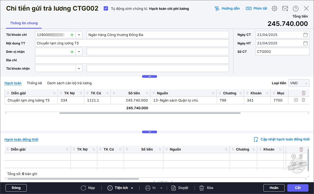 5. Sau khi thanh toán xong, phần mềm tự động hạch toán đồng thời tại tab Hạch toán đồng thời, ghi:
