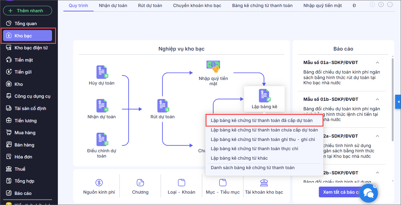 1. Vào phân hệ Kho bạc\Lập bảng kê\Lập bảng kê chứng từ thanh toán đã cấp dự toán.
