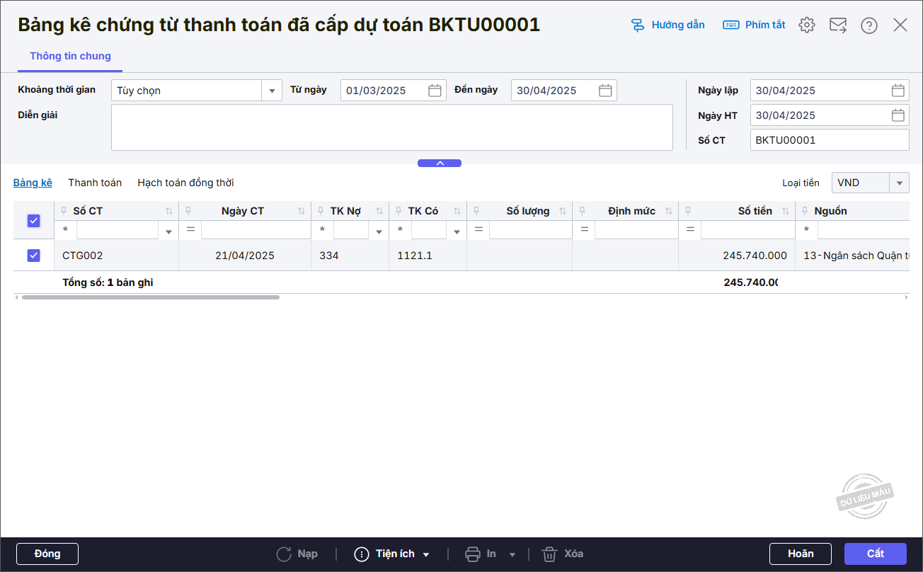 Bước 4: Lập bảng kê thanh toán tạm ứng
