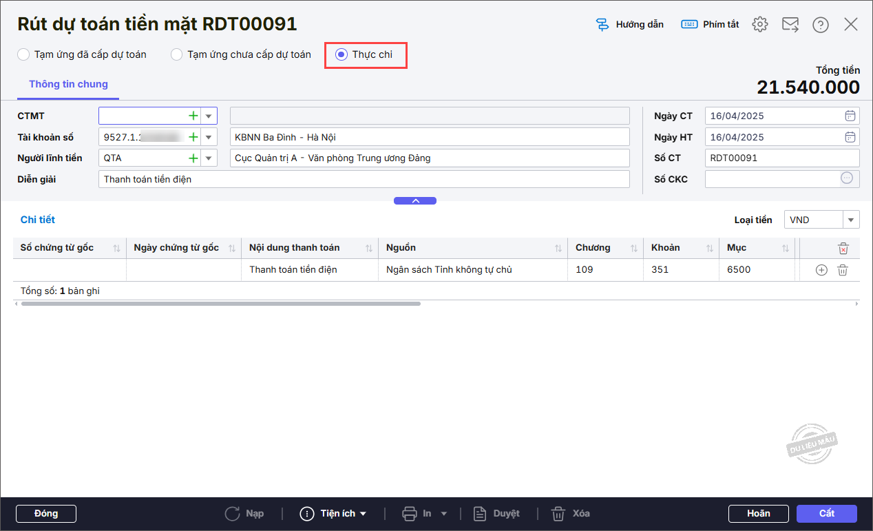 Bước 3: Khai báo thông tin về chứng từ Rút dự toán tiền mặt.