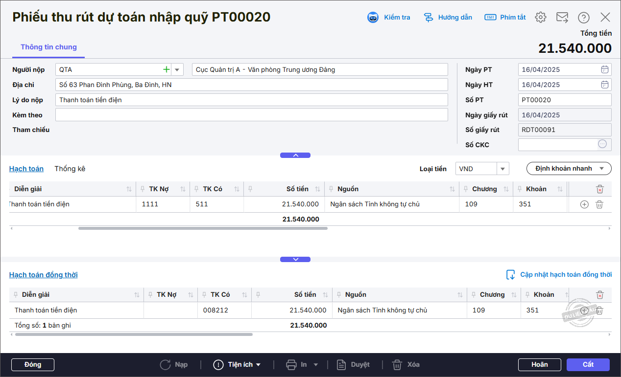 Bước 5: Bạn kiểm tra các thông tin trên Phiếu thu rút dự toán nhập quỹ, phần mềm mặc định sinh TK Nợ 1111/ TK Có 511 (nguồn không tự chủ) hoặc TK Có 1351 (nguồn tự chủ), nghiệp vụ Thực chi.