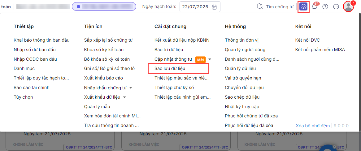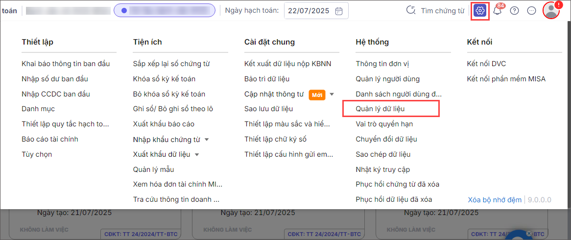 Bước 1: Vào phần Bánh răng ⚙(góc phải bên trên)\Hệ thống\Quản lý dữ liệu.