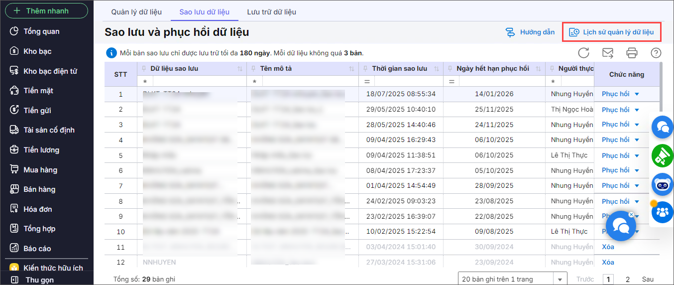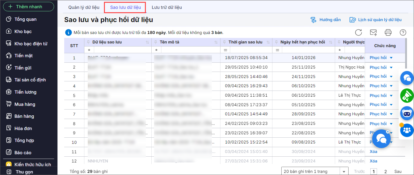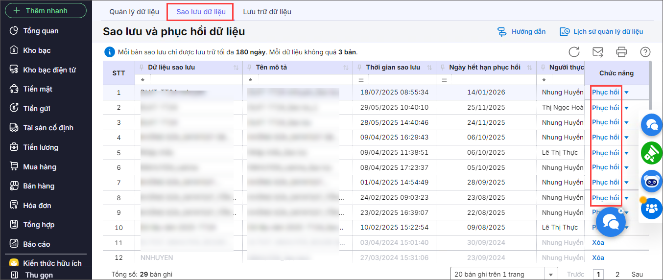 • Tại đây anh/chị có thể xem được thông tin các dữ liệu đã sao lưu gồm: Tên mô tả, Thời gian sao lưu, Ngày hết hạn phục hồi, Người thực hiện, Trạng thái, Phiên bản, Dung lượng.